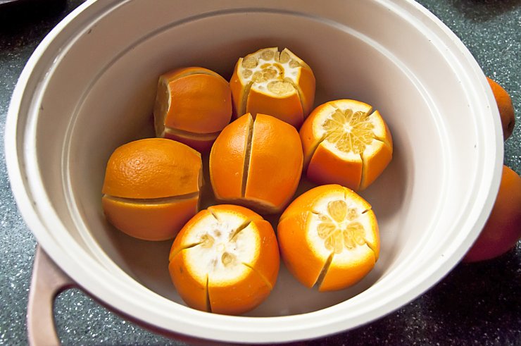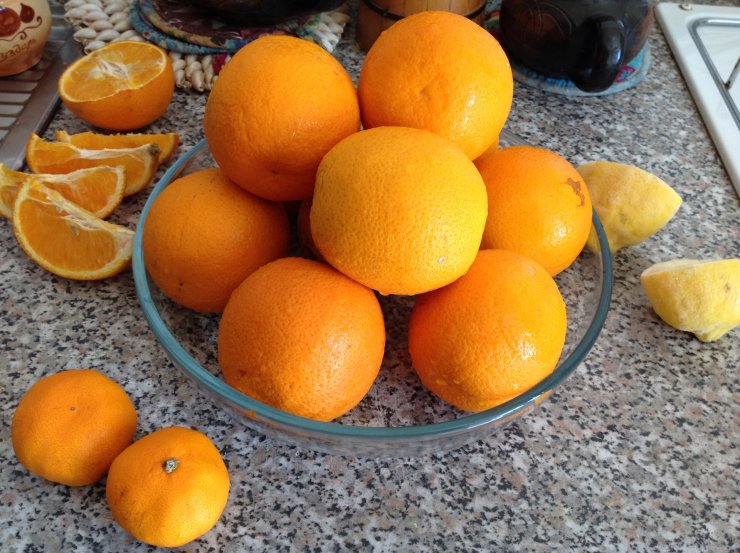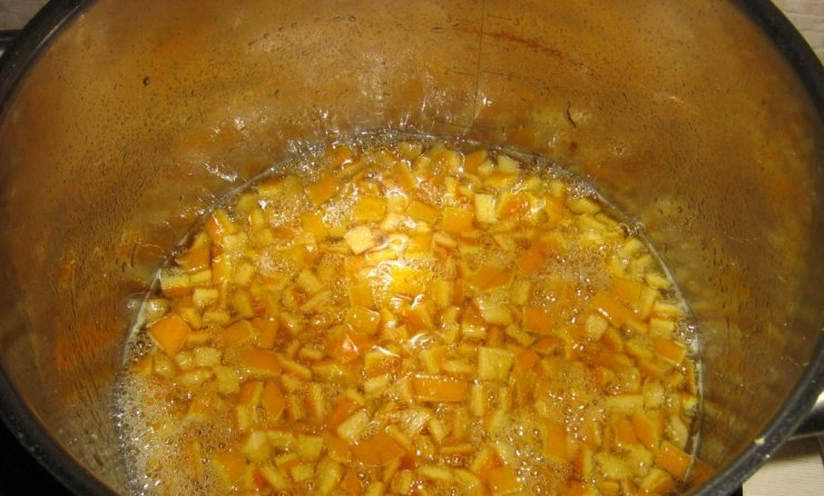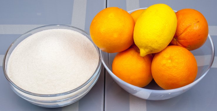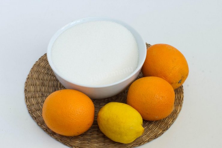 Рецепт приготовления апельсинового варенья состоит из 5 крупных цитрусовых, половины лимона, сахара исходя из веса фрукта из расчета 1/1.