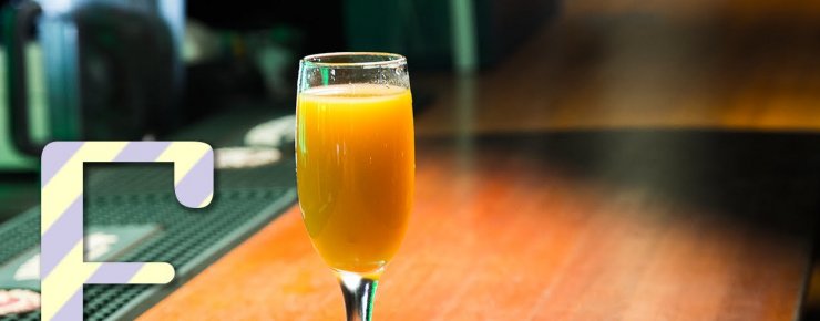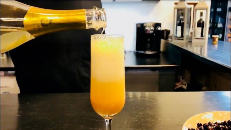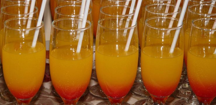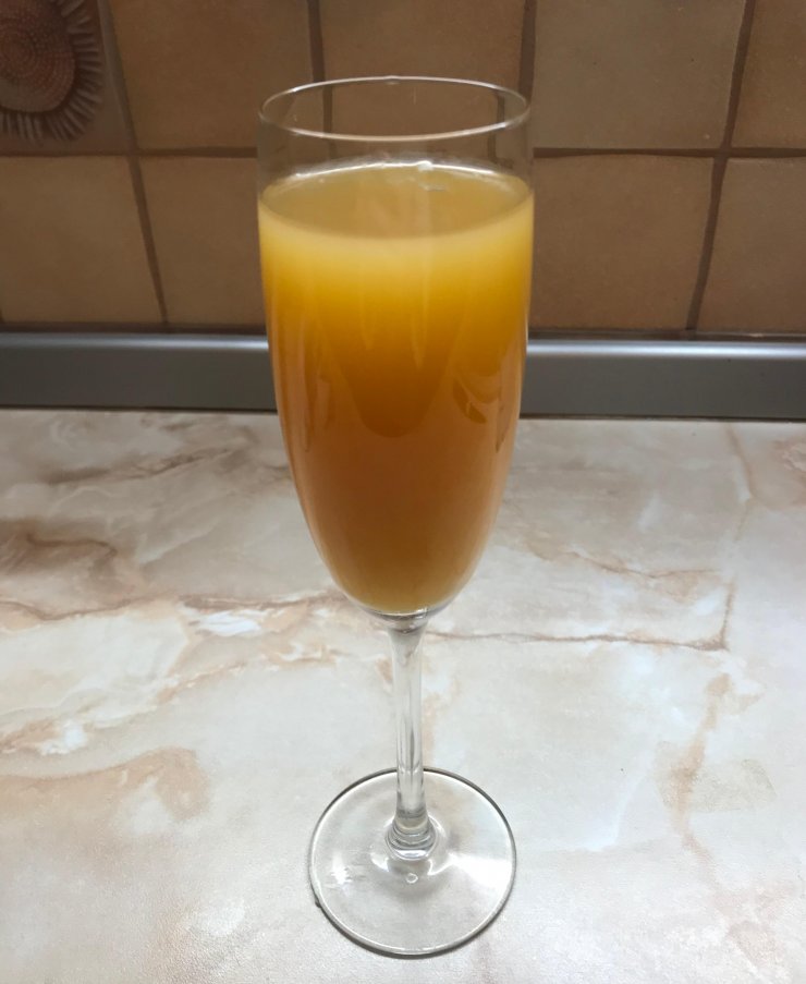 - Высокий стакан заполните соком до половины. Сверху влейте шампанское.