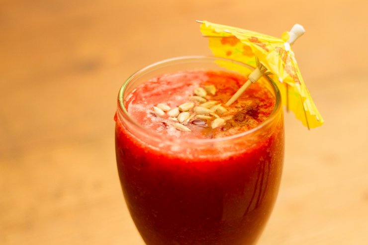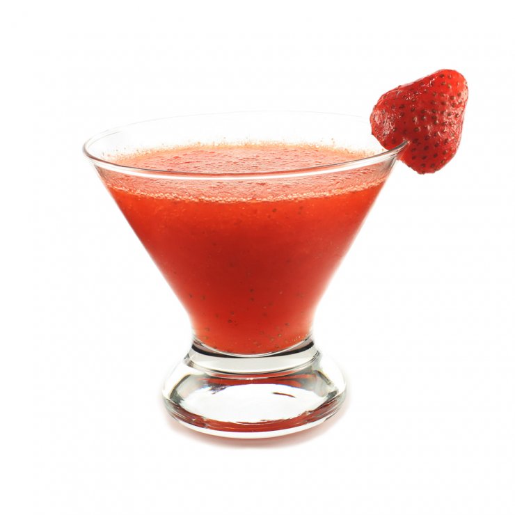 Компоненты перемешиваются в блендере и разливаются по бокалам. Здесь лучше воспользоваться мелким ситечком, чтобы клубничные зернышки не мешали предаваться наслаждению от напитка.