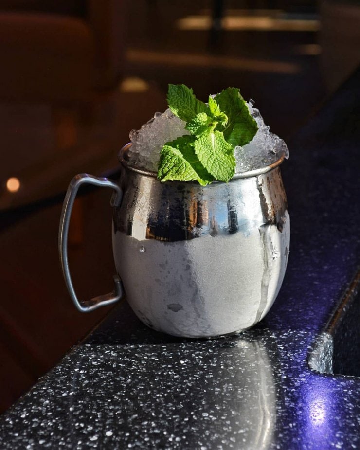 После чего в течении минуты перемешивают барной ложкой. В завершении украшают стеблем свежей мяты.
