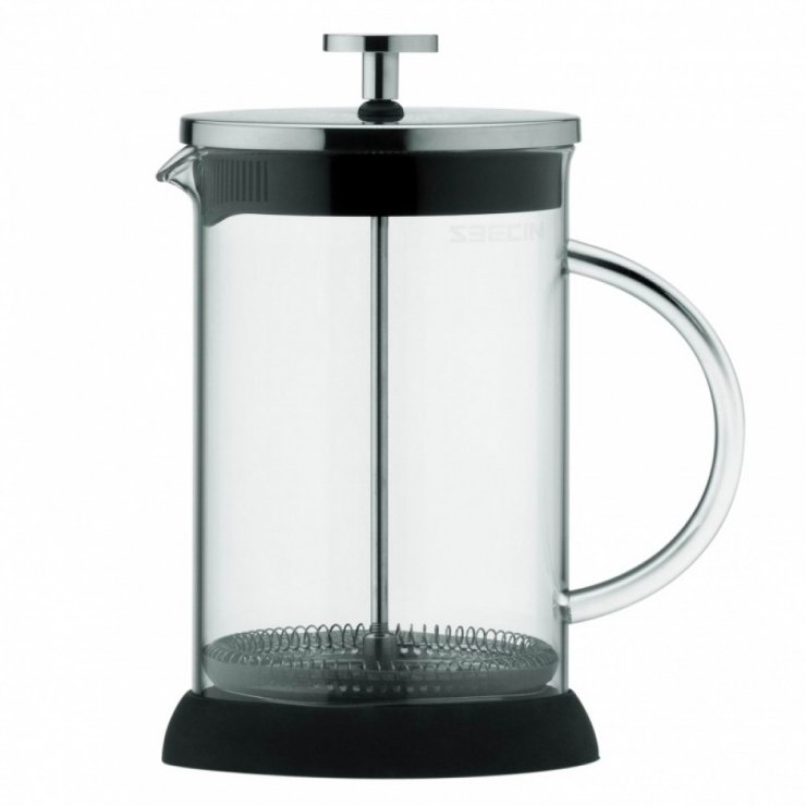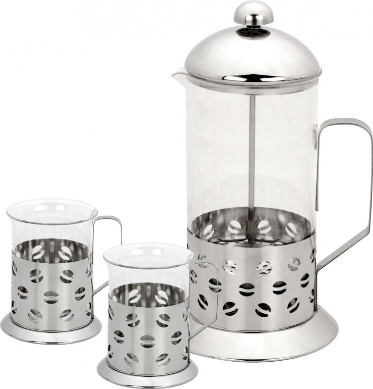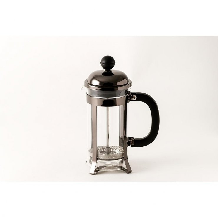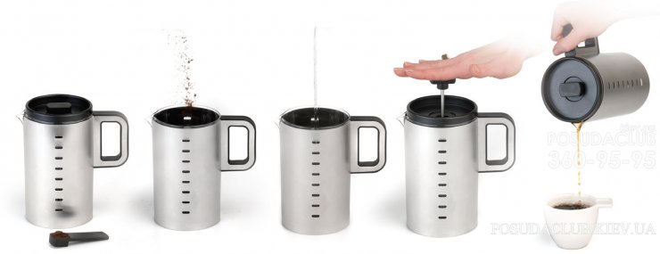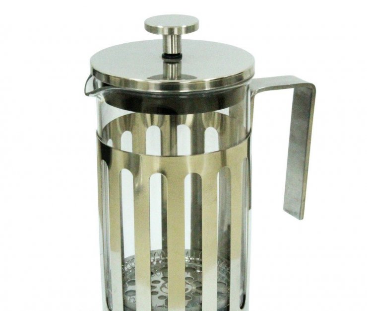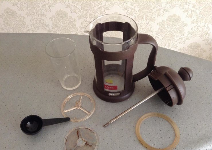 Прибор представляет собой заварник с прессом, состоит он из колбы, плунжера (пресс в виде поршня с ручкой) и сеточки-фильтра.
