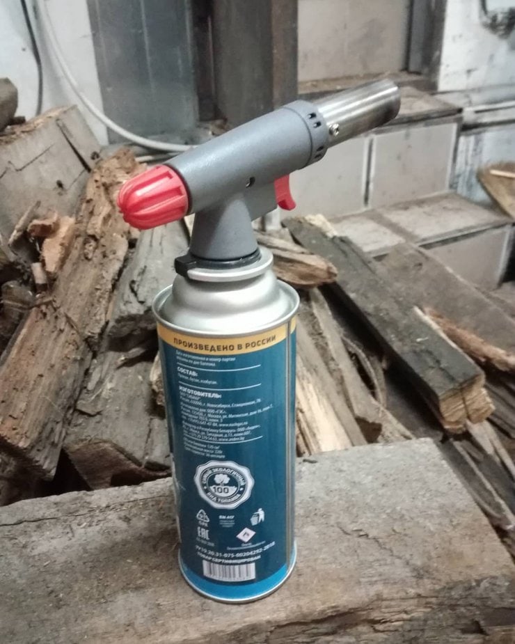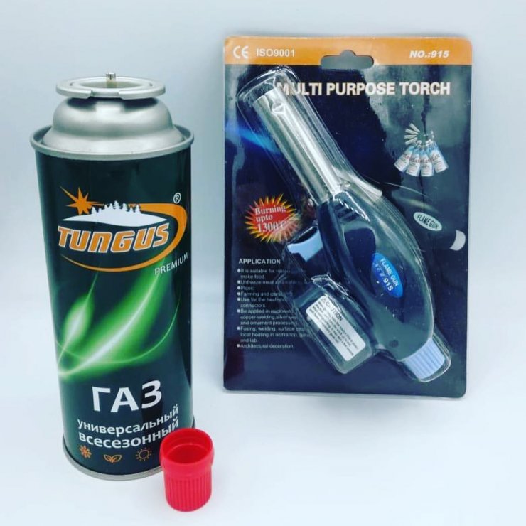 Баллон с пропаном и сам фломбер продаются не соединёнными друг с другом. Сверху баллона нужно снять пластмассовый колпак и вкрутить в пистолет.