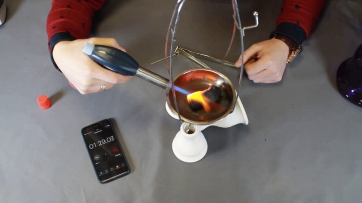При нажатии на кнопку у газовой горелки срабатывает пьезоподжиг: с пьезоэлемента вырабатывается искра, от которой вспыхивает газовый поток. Так прибор дает пламенную струю.