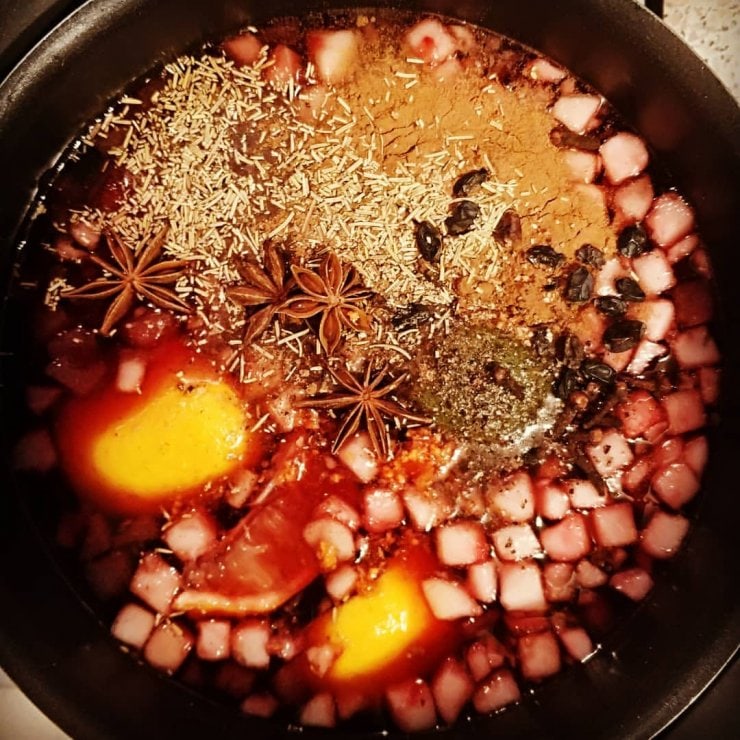 Состав полностью залить вином и при температуре 60 градусов томить около 20 минут. По окончанию варки, добавить ром и настаивать сутки в холодильнике.