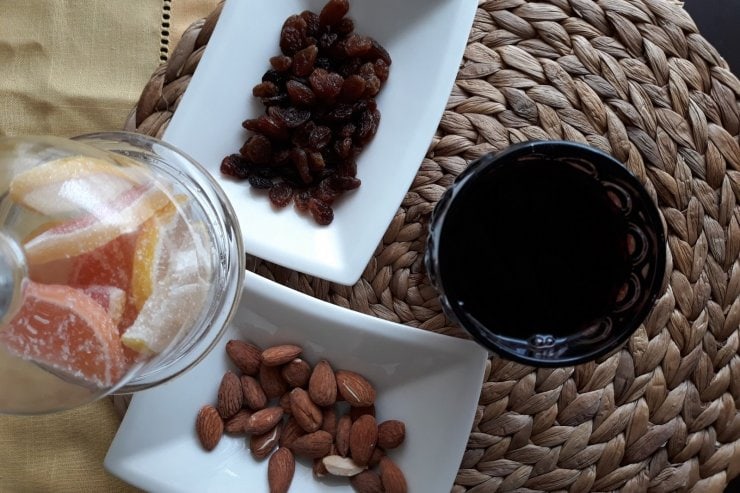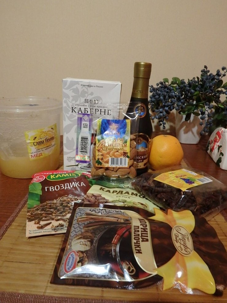 Для приготовления потребуется: одна бутылка красного сухого вина, сто грамм сахара (прекрасно подойдет и коричневый сахар), небольшая горсть изюма, две палочки корицы, толченый миндаль около пятидесяти грамм, апельсиновая цедра и пятьдесят или сто грамм водки или коньяка.