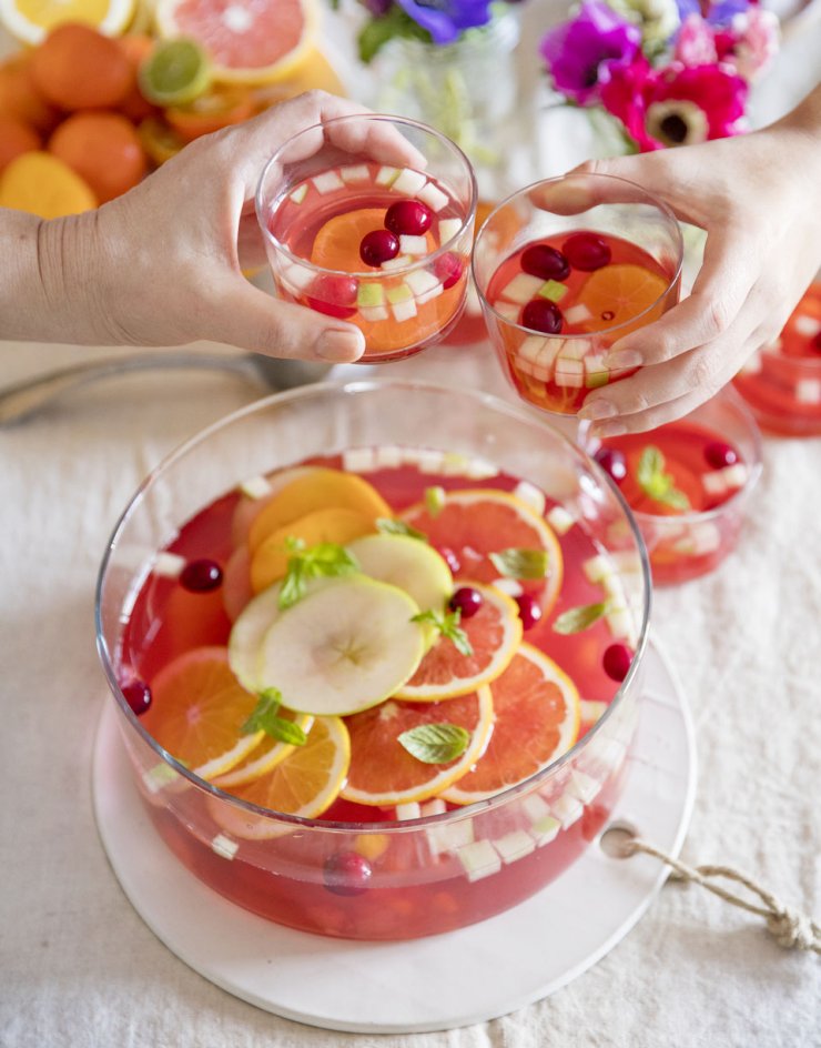Когда вино нагреется, воду из миски выливают, кладут туда фрукты, ром и наливают сок. Горячее вино наливают туда через сито, чтобы на нем остались пряности.