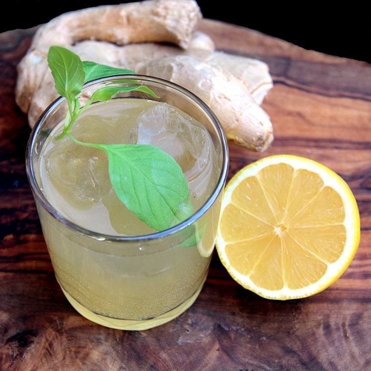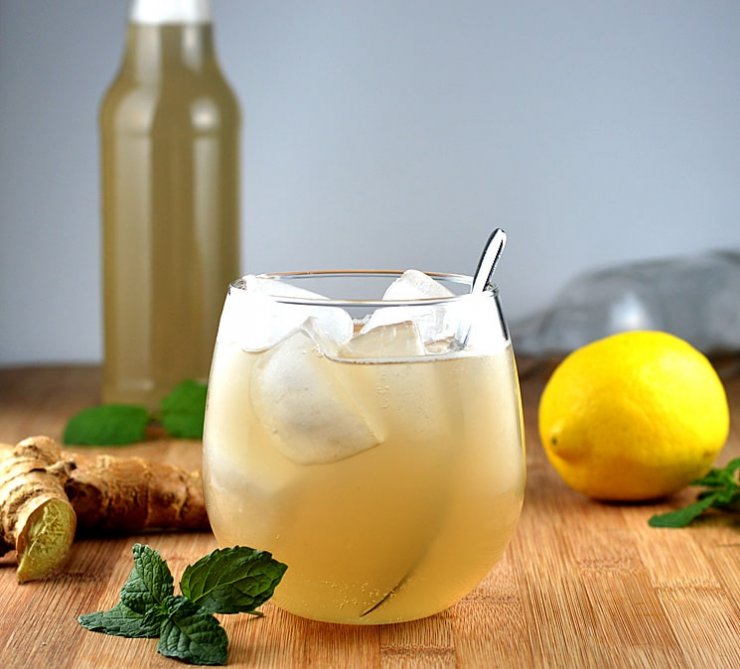 Ингредиенты: 2 столовых ложки сахара, 30 граммов корня имбиря, сок одного лимона, 2-3 листа мяты, 1,5 литра минеральной воды.