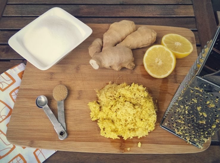 Очистить и натереть корень имбиря, смешать с лимонным соком и сахаром.