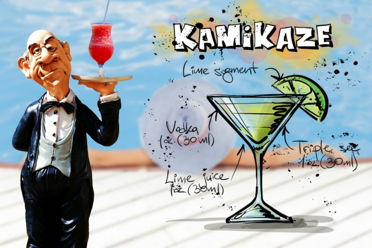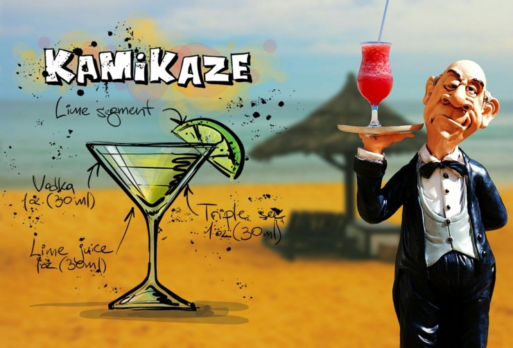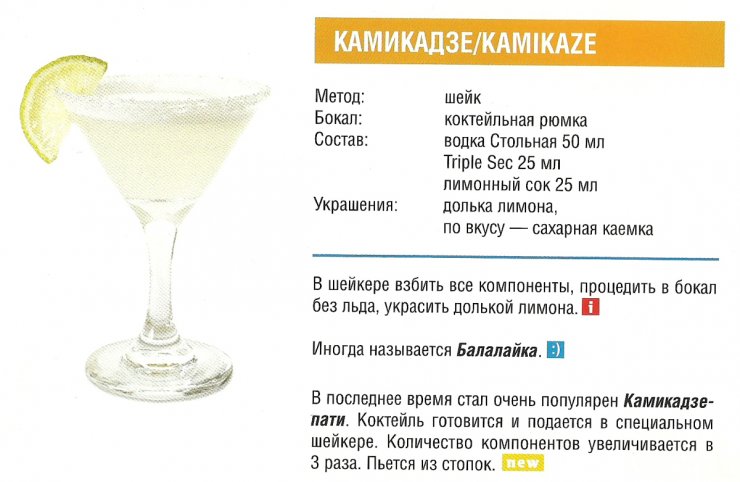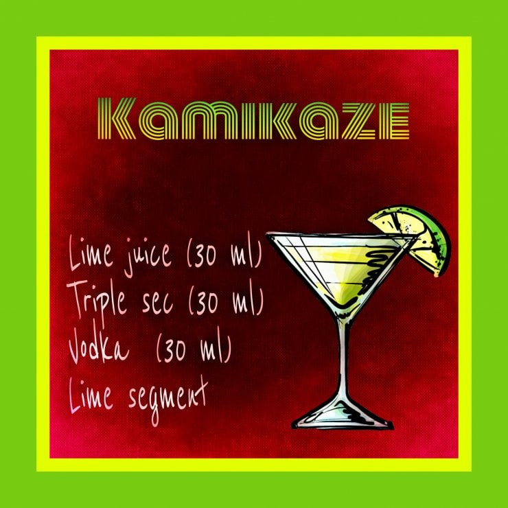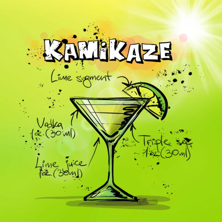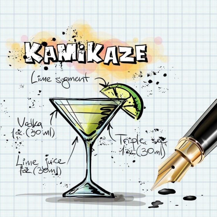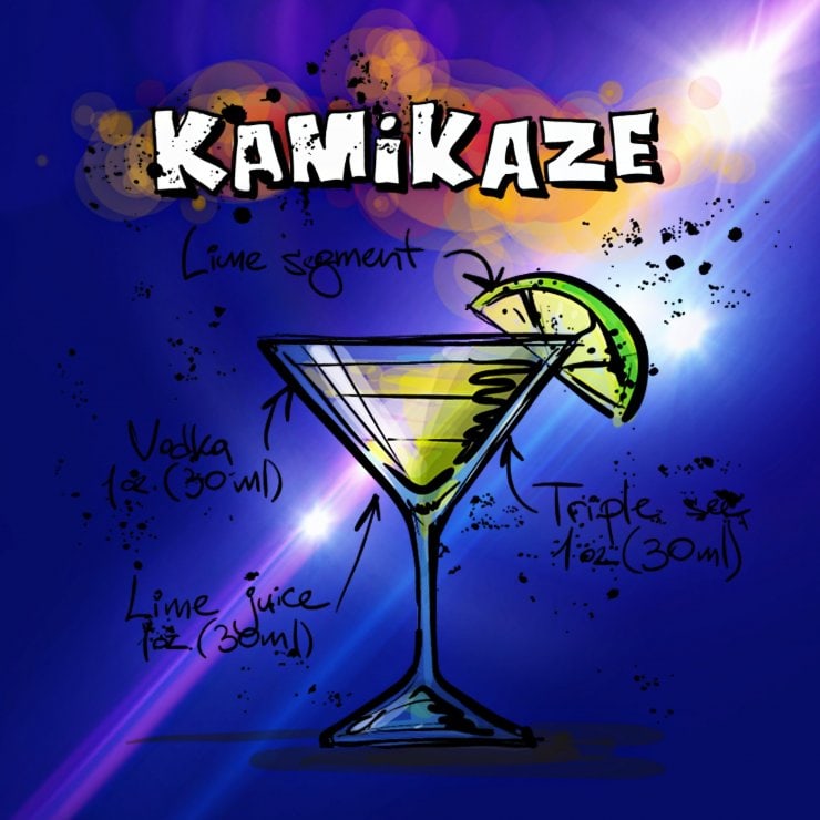 Рецепт приготовления коктейля «Камикадзе» уходит корнями далеко в историю, впервые его создали японские бармены во время Второй Мировой войны. В его состав входят следующие ингредиенты — апельсиновый ликер, водка и лаймовый сок.