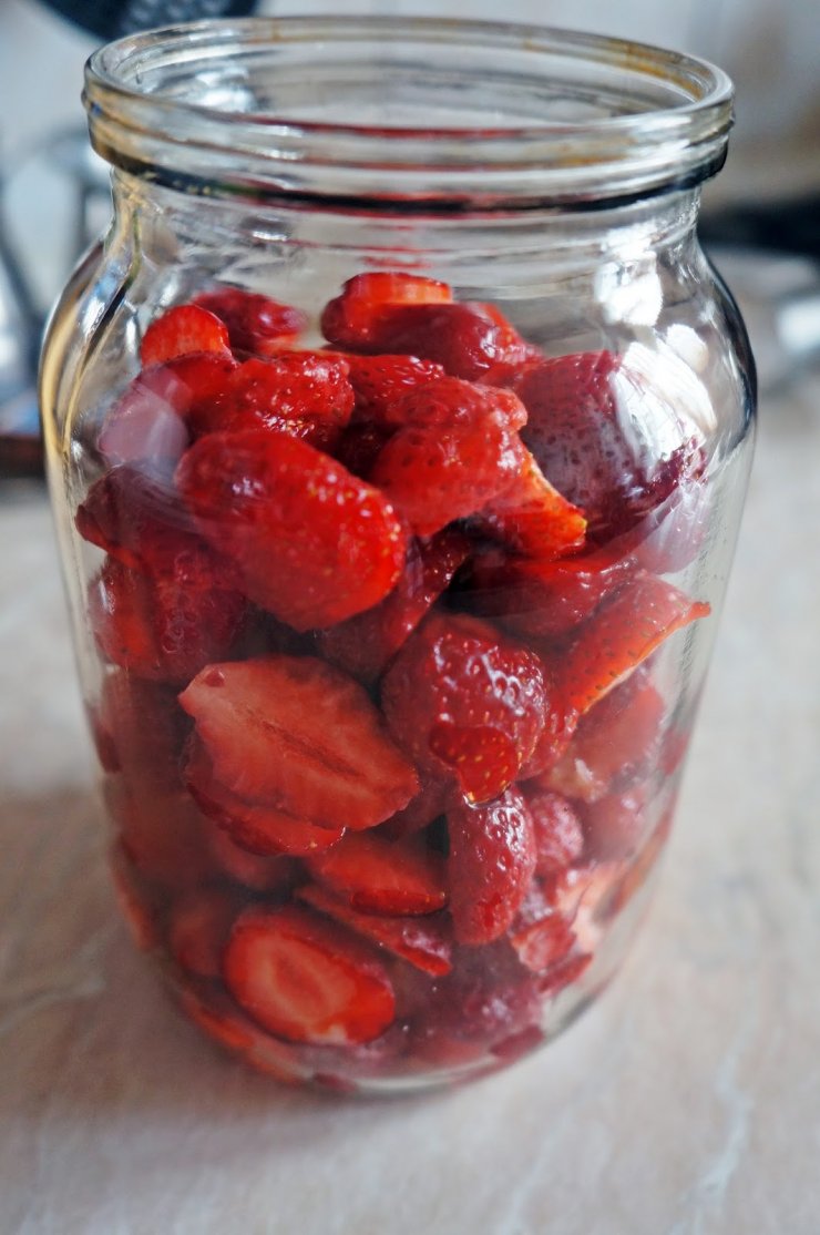 Берем стеклянную тару кладем в нее порезанную клубнику и заливаем либо коньяком либо водкой, закрываем крышкой. По истечению нескольких суток необходимо будет долить алкоголь, так как клубника впитает в себя некоторое количество.