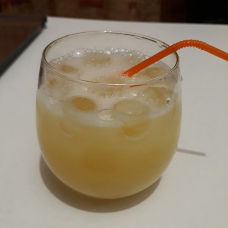 - В блендер с чашей загружается 30 мл сиропа кокоса, 20 мл персикового, 100 мл сока ананаса, шарик мороженого и банан;