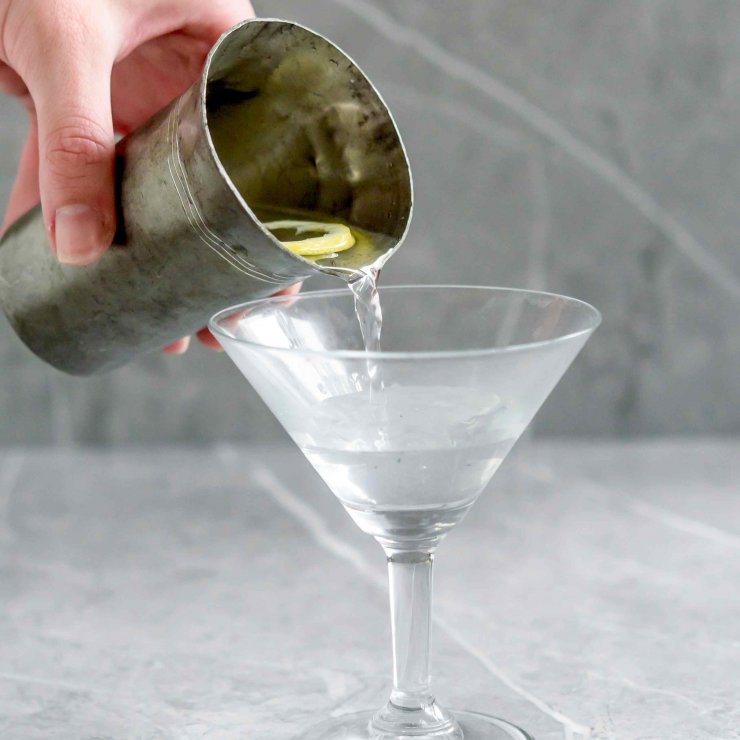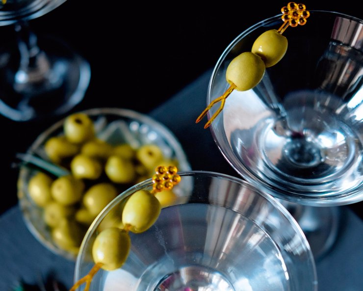 Теперь самое время доставать бокал из морозильника и переливать через ситечко напиток в него. Украшается коктейль для подачи при помощи трех оливок на шпажке или цедры лимона.