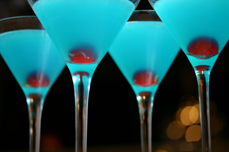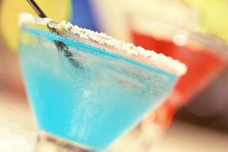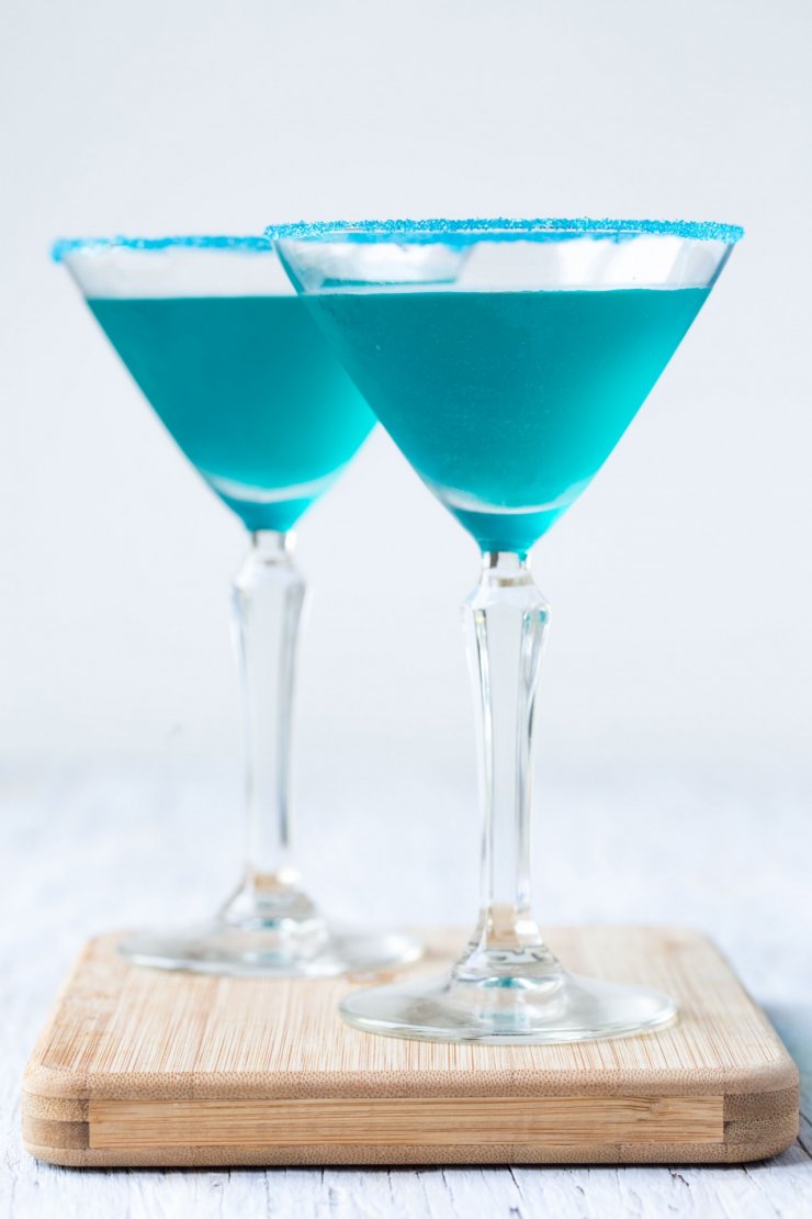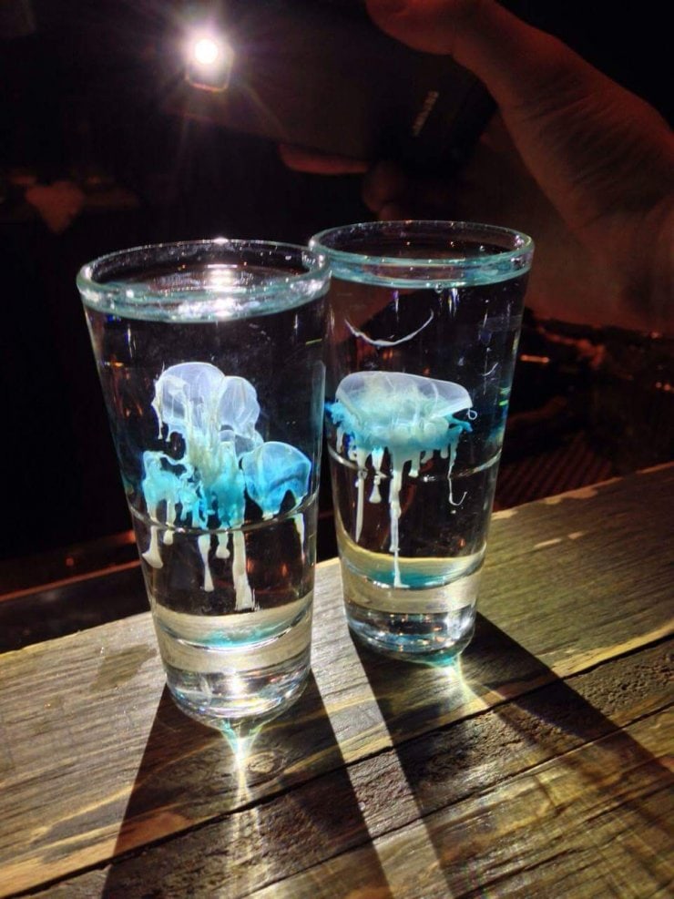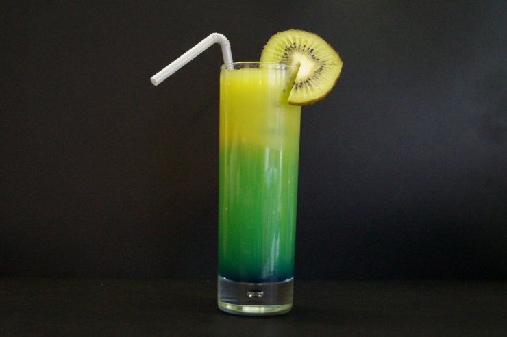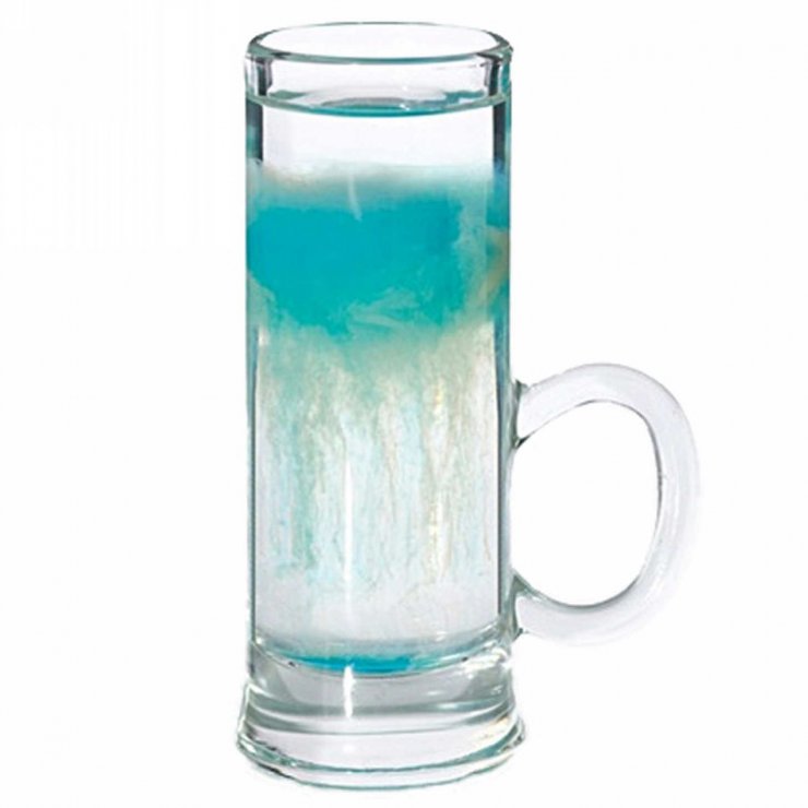 Если техника приготовления коктейля не нарушена, то готовый напиток получается кристально прозрачным с облаками голубого и зеленого цветов.