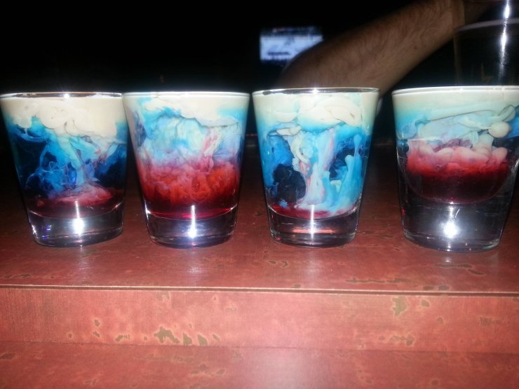 Вливать составляющие нужно очень аккуратно, чтобы они не смешались. Далее, используя трубочки для коктейлей, в центр содержимого аккуратно вливается несколько капель «Айриш крима» и «Блю кюрасао».