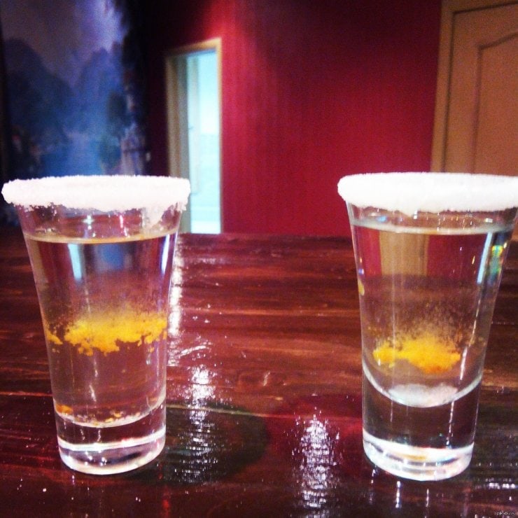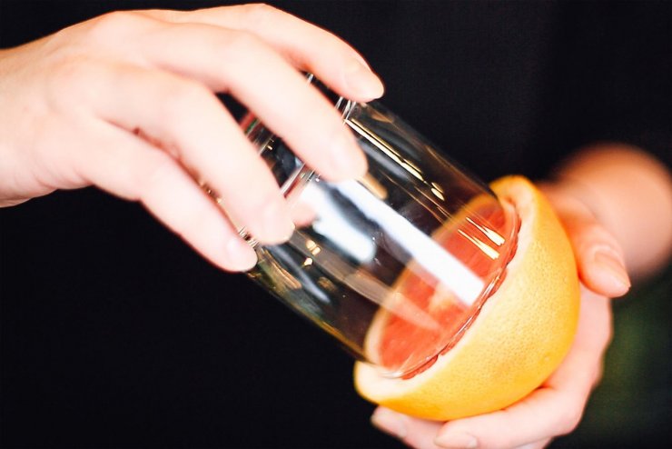 Для этого берется специальная стопка для шотдринка (shot drink). Грейпфрут разрезается пополам. После этого кромкой стопки, который будет браться в рот, нужно прикоснуться к грейпфруту.