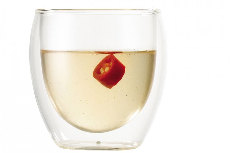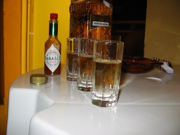 Для этого на дно бокала наливается лимонный сок. Затем по барной ложке аккуратно вливается водка. И после этого копается сверху соус табаско.