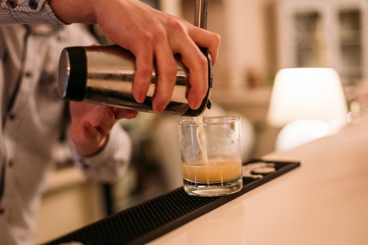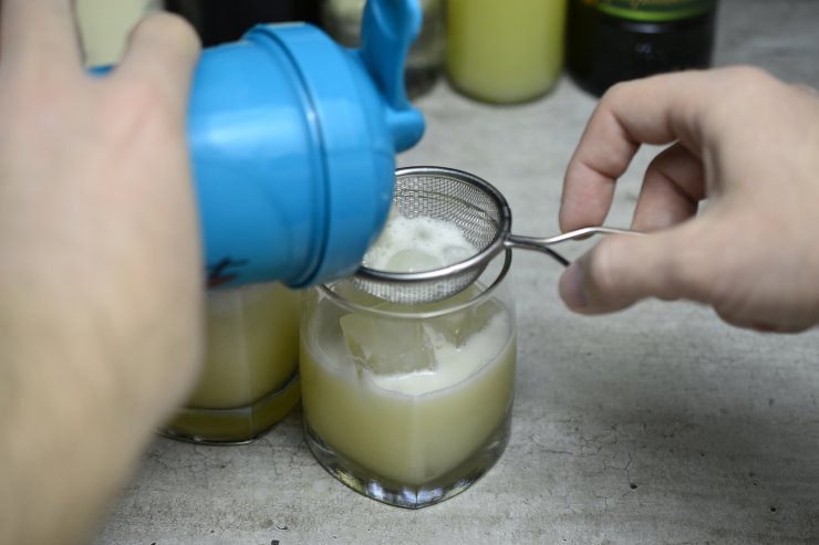 - А затем через ситечко (стрейнер) переливается спиртное в подготовленные бокалы и добавляется лёд.