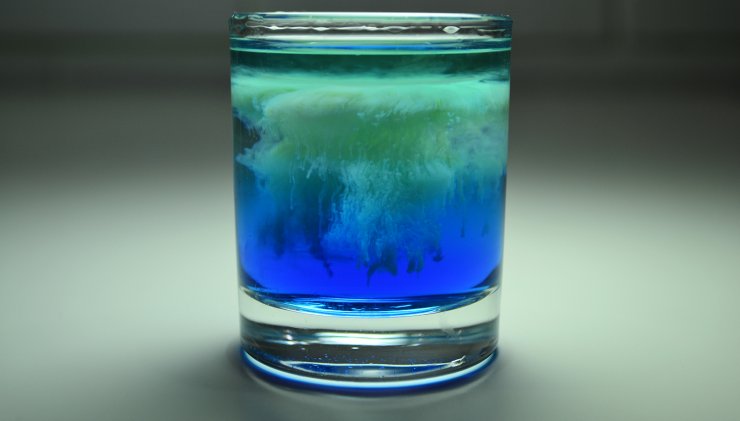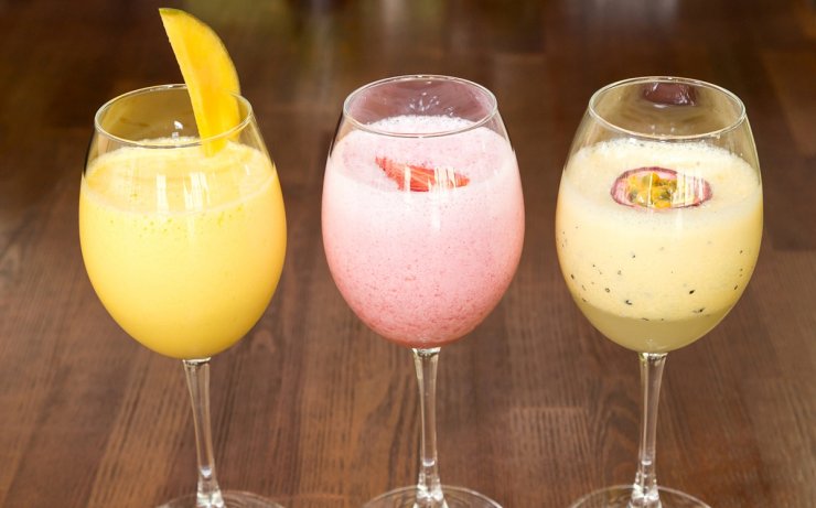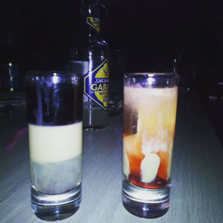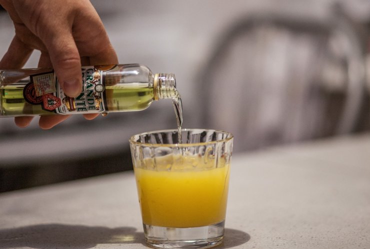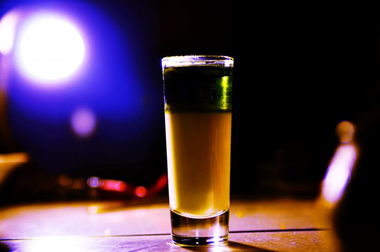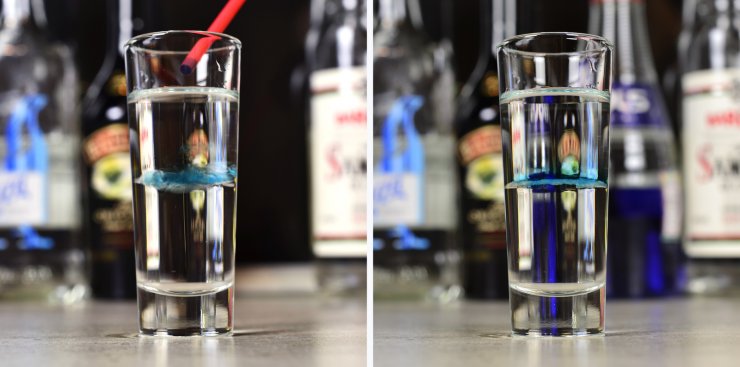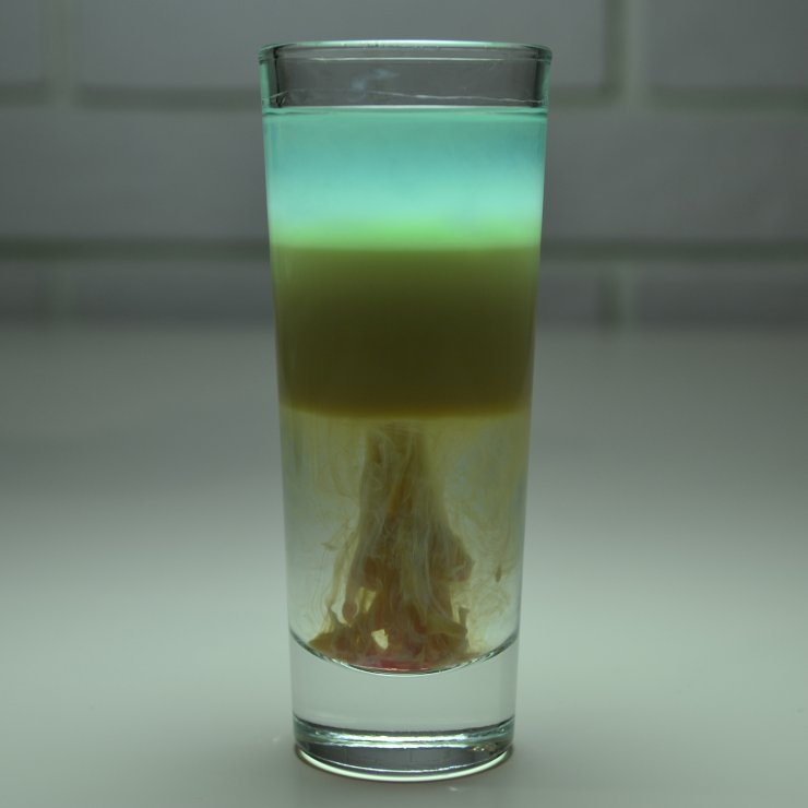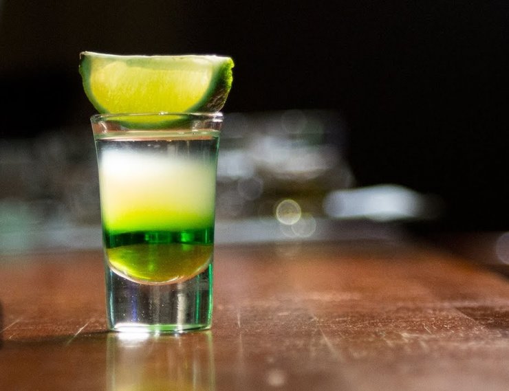 Смесь помещаем на дно бокала и добавляем абсент. Слои не должны совместиться, тогда коктейль будет двухцветным.