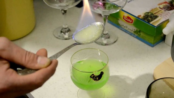 Из-за нехватки воздуха, абсент потухнет. Употреблять необходимо залпом.