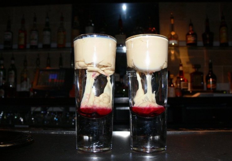 Способ изготовления: сначала налить самбуку, затем по лезвию вливаем Бейлис, и завершающий абсент. Когда капнем сироп, он сымитирует взрыв.