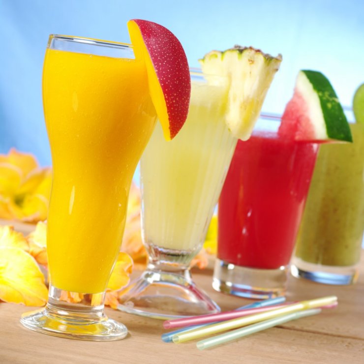 Получившуюся массу хорошо взболтать в шейкере, осторожно влить в бокал с колотым льдом, край бокала можно украсить кусочком свежего ананаса. Подается с соломинкой.