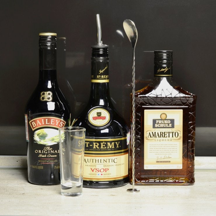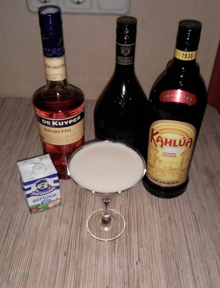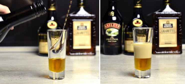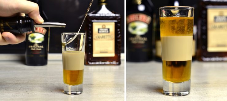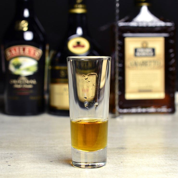 Ликер Амаретто 25-30 мл., аккуратно наливается в бокал тонкой струйкой, затем, используя десертный нож, аккуратно влить ликер Baileys 25-30 мл., далее также используя десертный нож, доливаем 25-30 мл. бурбона, все ингредиенты в равных пропорциях, никакого льда.
