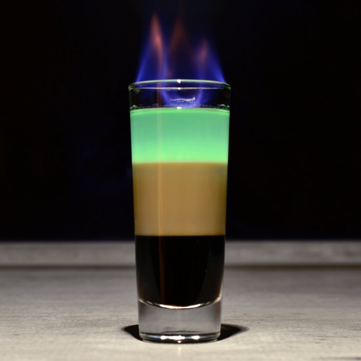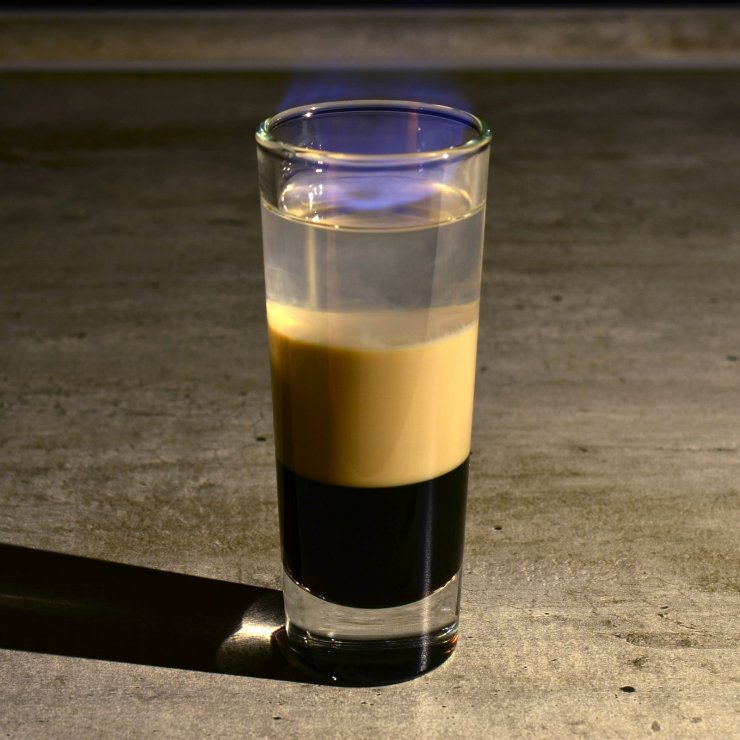Смешайте по 15 мл. амаретто, бейлис и виски, подожгите и выпейте.