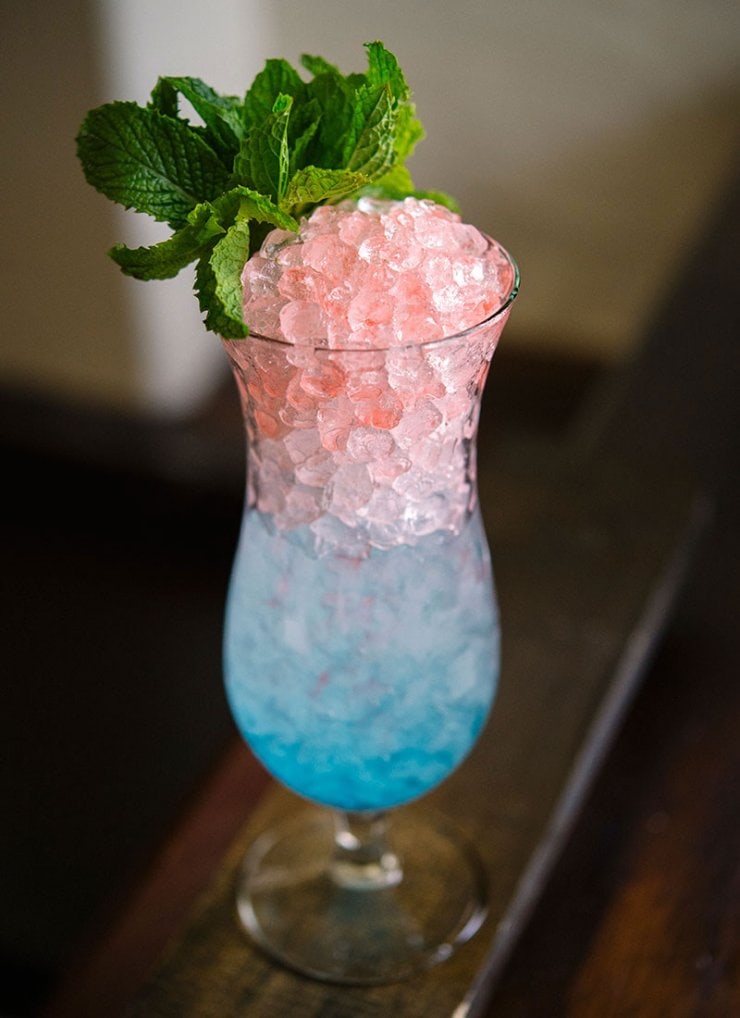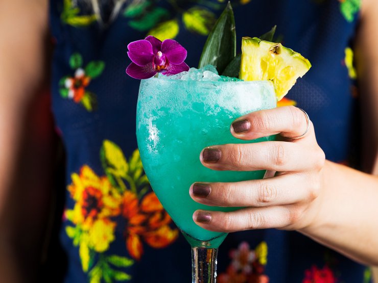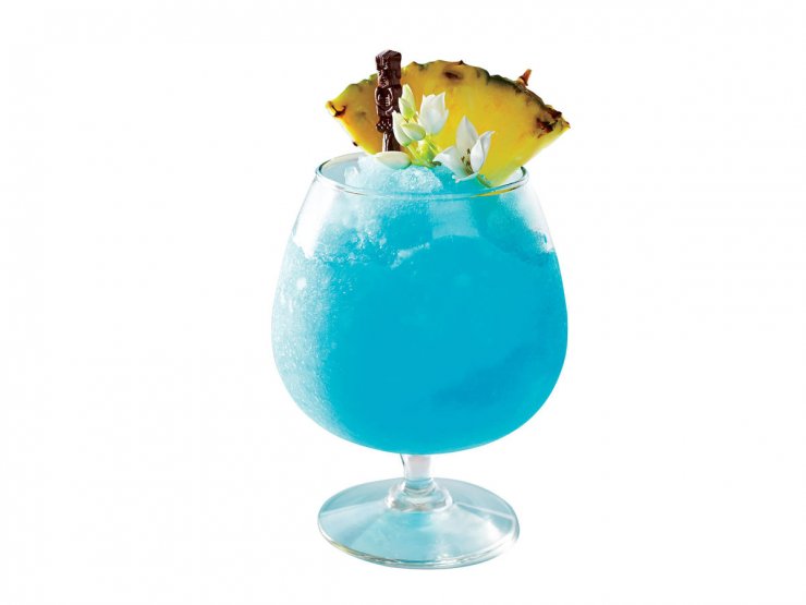 Ингредиенты: ананасовый сок, карибский ром Малибу, Blue Кюрасао, лед, долька ананаса и сахар для украшения.