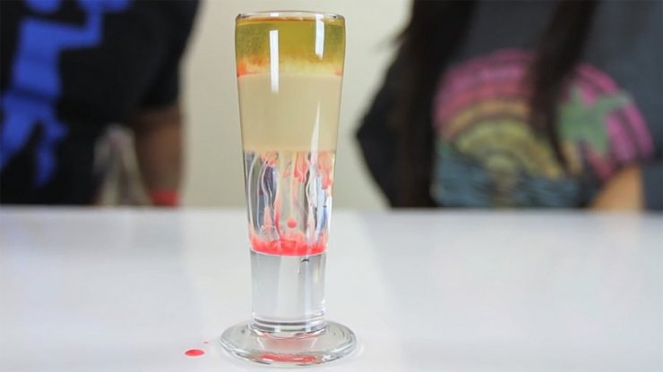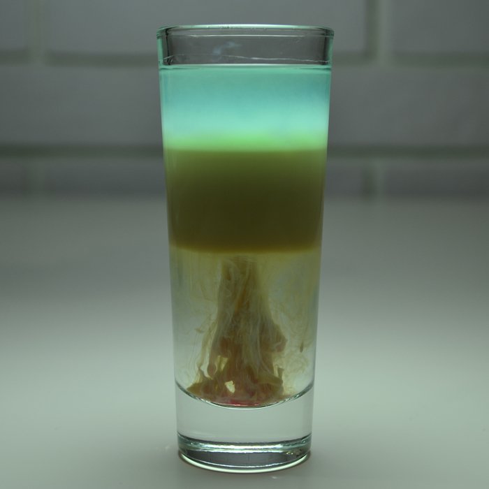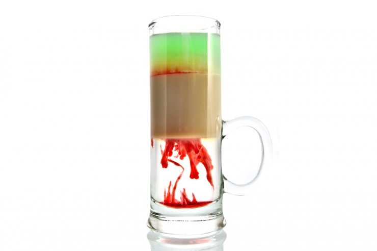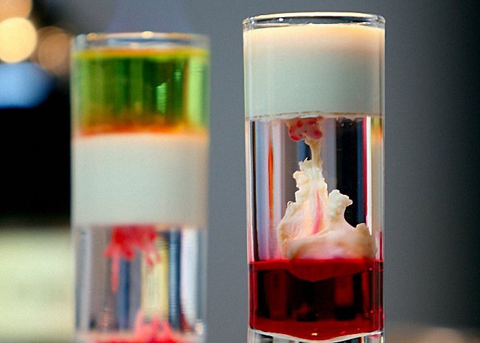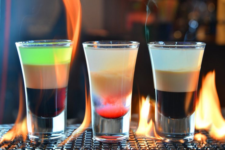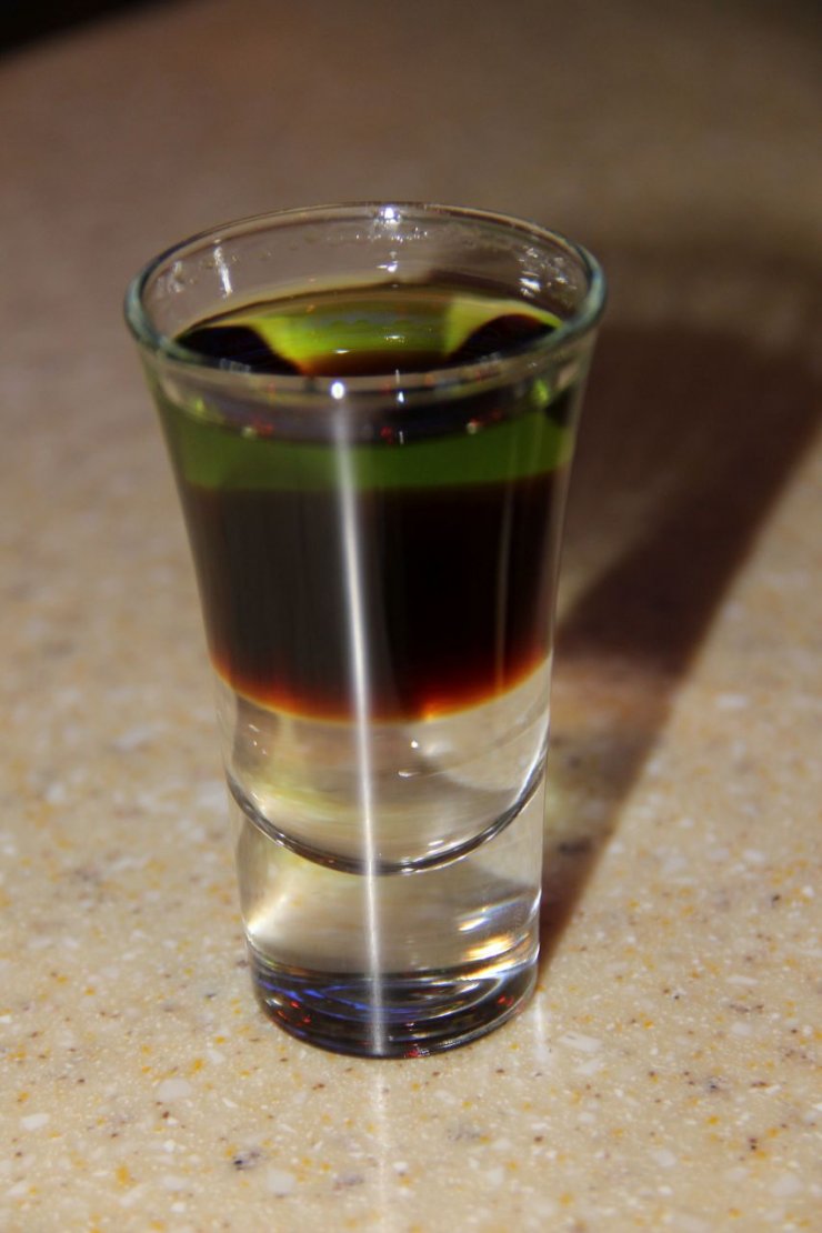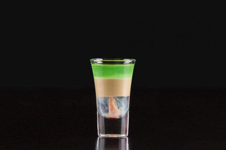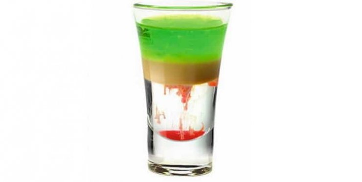 В этом коктейле существует хитрость, она заключается в том, чтобы правильно расположить слой в напитке. При хорошо выверенных действиях получится красивый рисунок из взрыва и полос, который можно встретить на фото коктейлей с самбукой.
