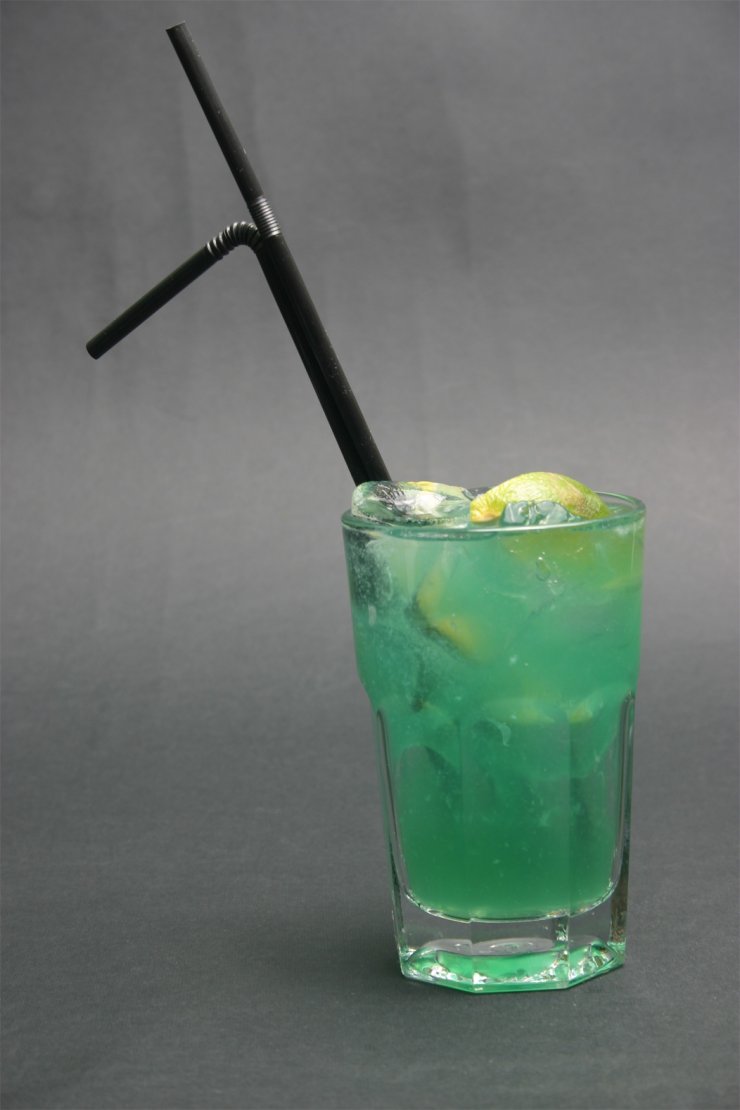 И, конечно, гренадин, который через трубочку добавляется на дно бокала. Количество сиропа составит всего несколько капель, до образования красивого взрыва;