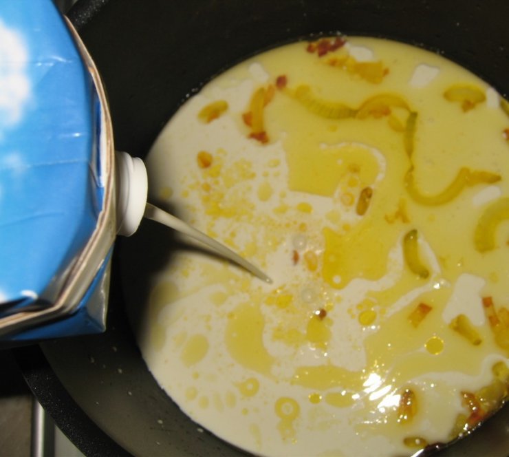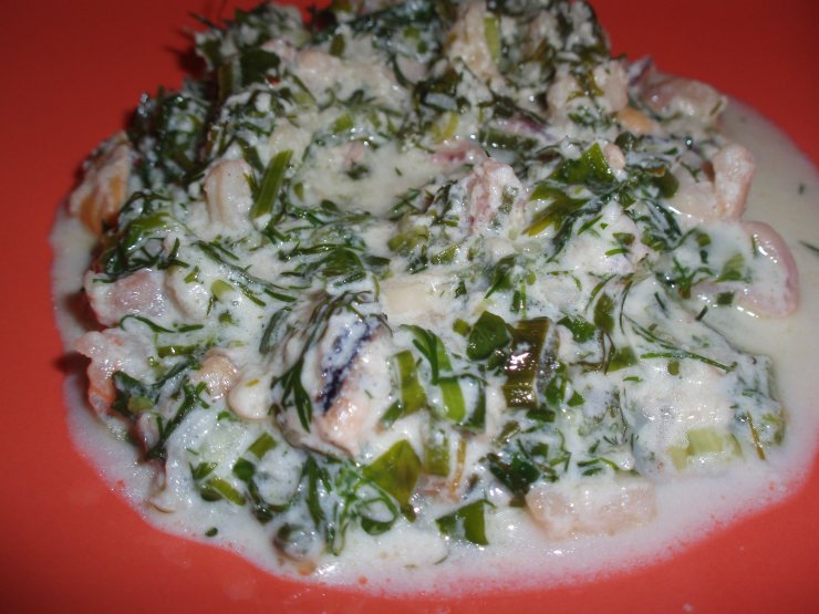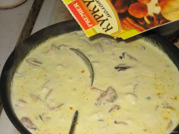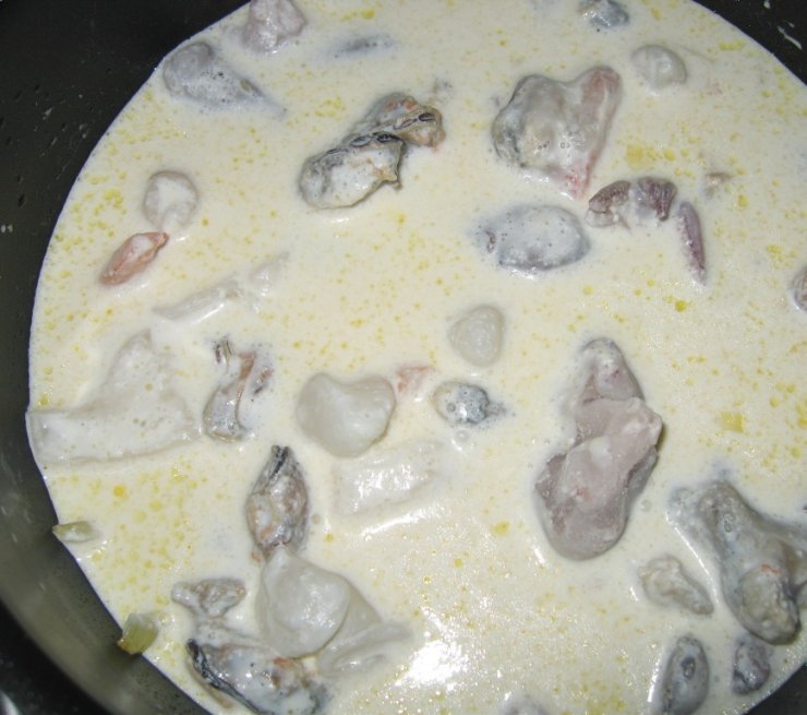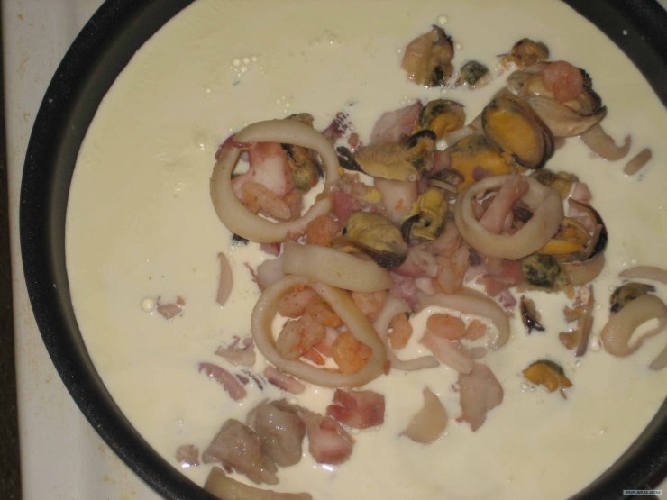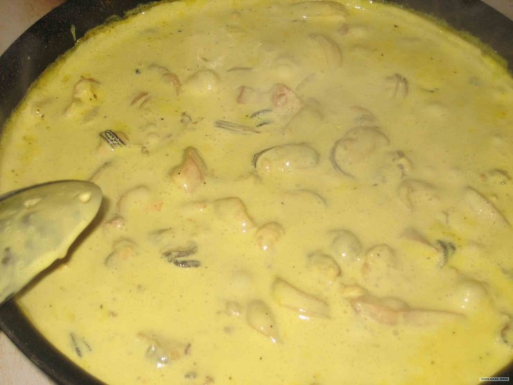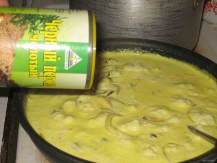 - после закипания сливок, предварительно размороженный морской коктейль перекладывается на сковороду и тушиться 6-7 минут на медленном огне.