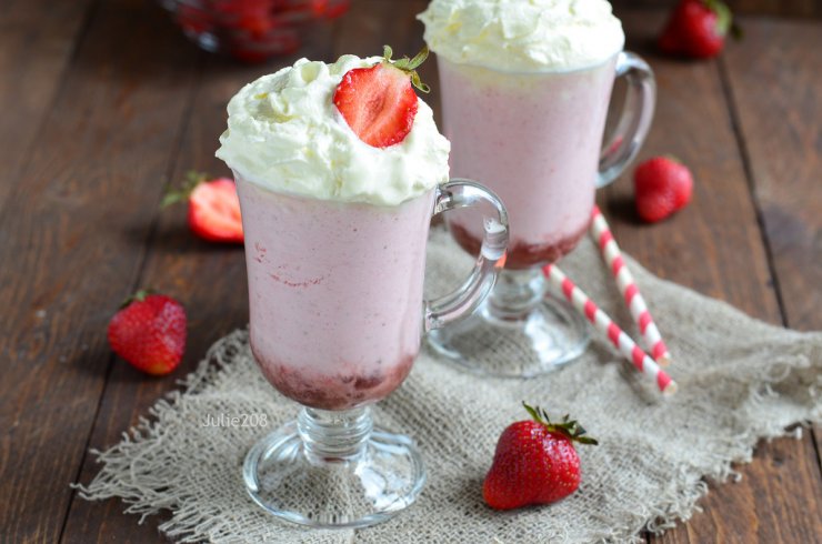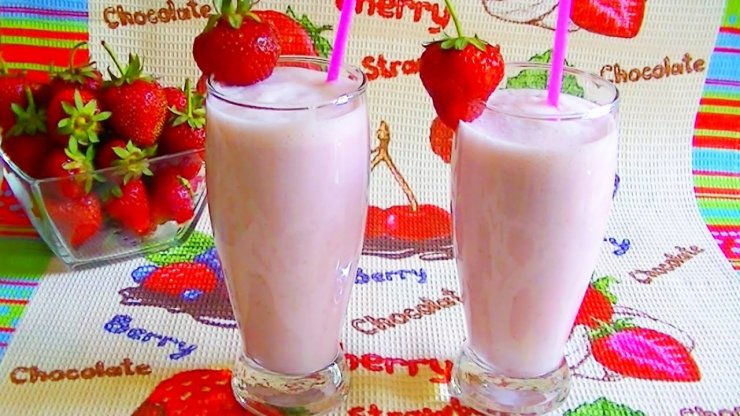- готовый коктейль разливается в фужеры, оформляется цельными ягодами клубники и подается к столу.