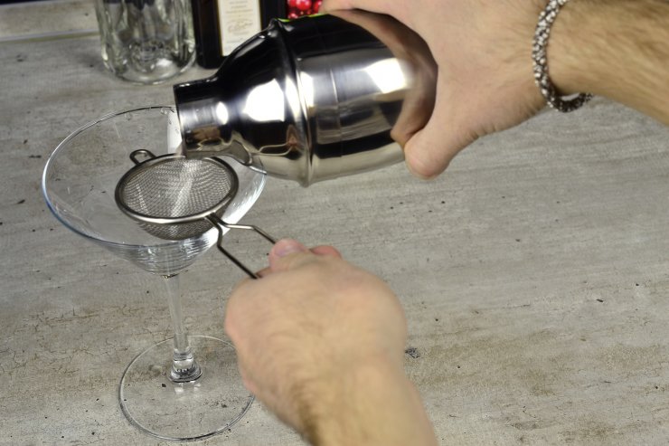 Начинается приготовления с того, что бокал для коктейля убирается в морозильную камеру для охлаждения. Затем в шейкер кладем лед и переливаем в него все жидкости.