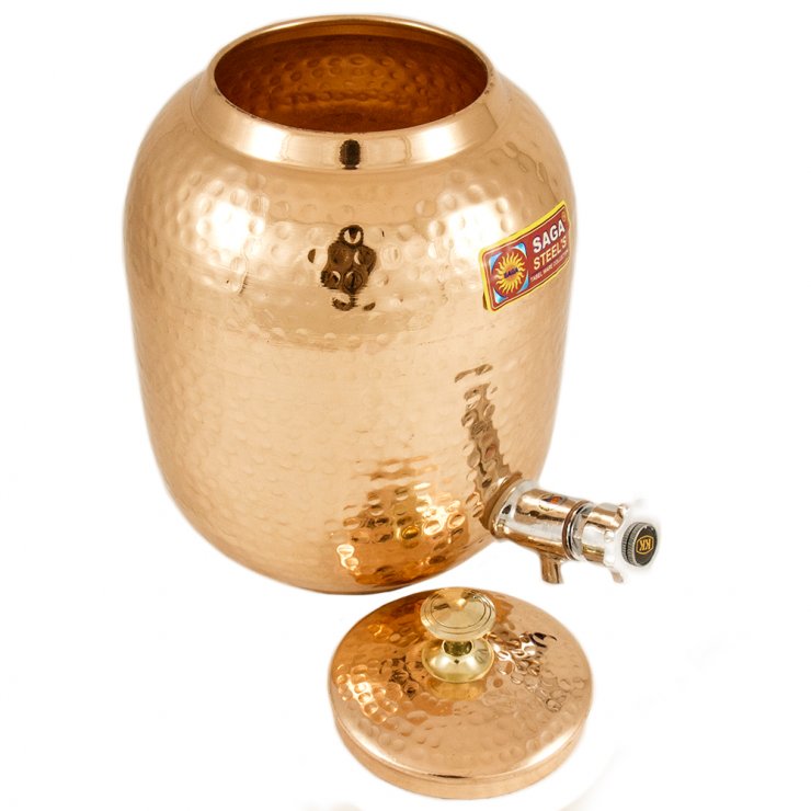 Медь смотрится богато на праздничном столе. Способна уничтожить бактерии в напитке. Славится своей долговечностью эксплуатации.
