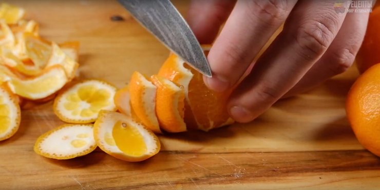 Вымываем мандарины, а следом режем их так же, как и в предыдущих рецептах.