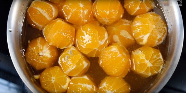 Достав контейнер ровно в срок, мы фильтруем содержимое. Из мякоти мандарин выдавливаем сок, добавляем в него сахар и варим из получившейся смеси сироп. Далее – ставим его остыть.