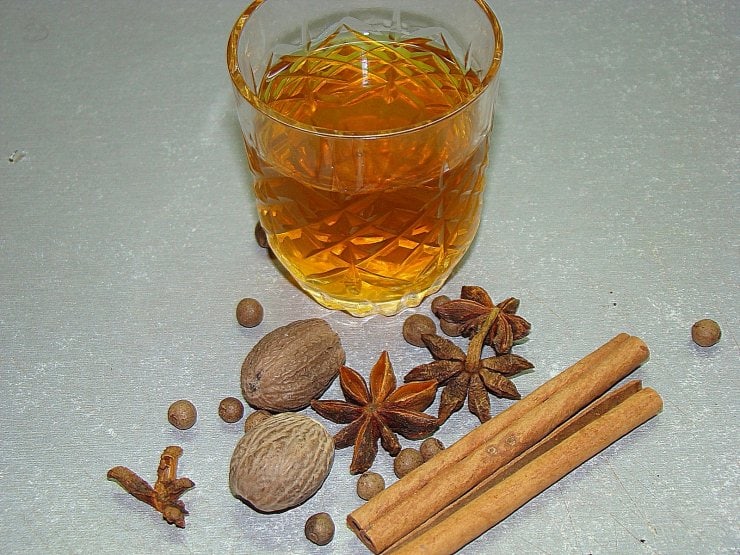 После дает нашему пряному сиропу немного остыть, далее смешиваем его со спиртом. Потом перелейте всю нашу смесь в емкость из стекла, нужно дать настояться 3-4 дня при комнатной температуре. Остается только слить мутный осадок и можно разливать по бутылкам.