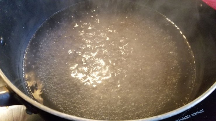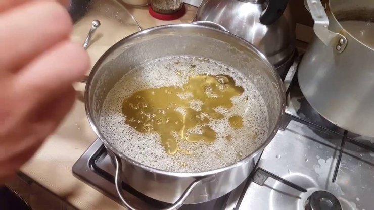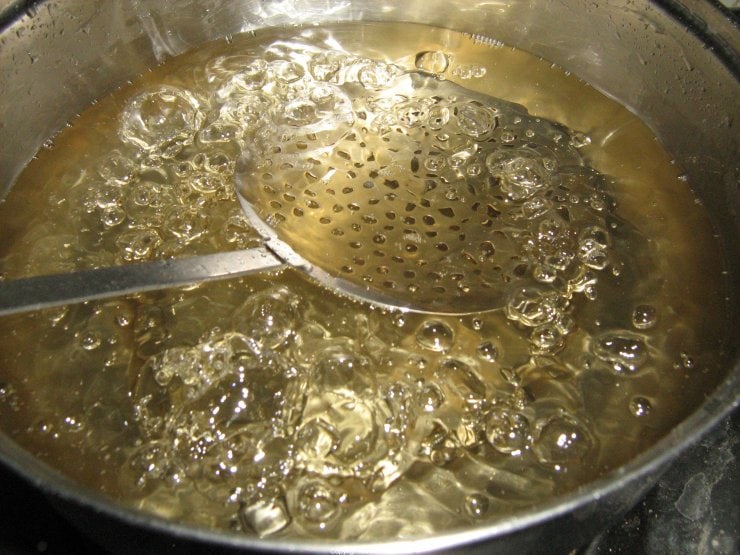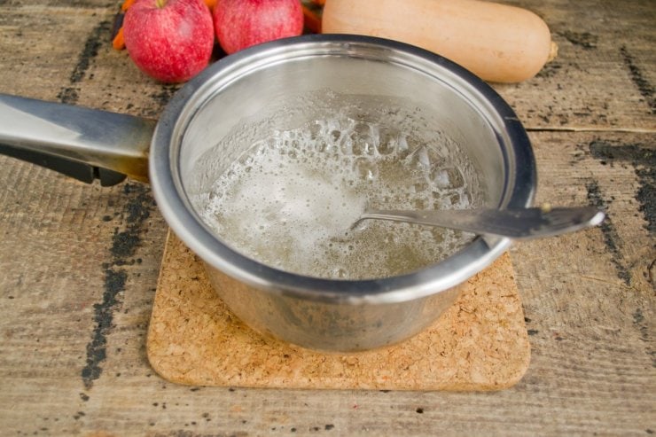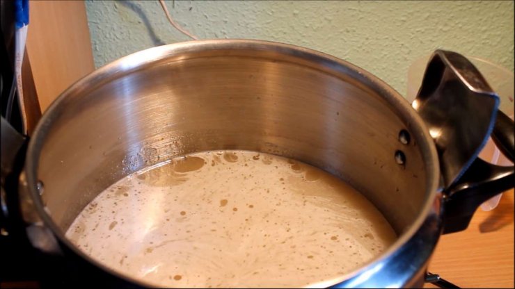 Поставьте емкость на средний огонь и постоянно помешивая, дождитесь, когда он закипит. В процессе приготовления нужно регулярно снимать появляющуюся на поверхности пенку.
