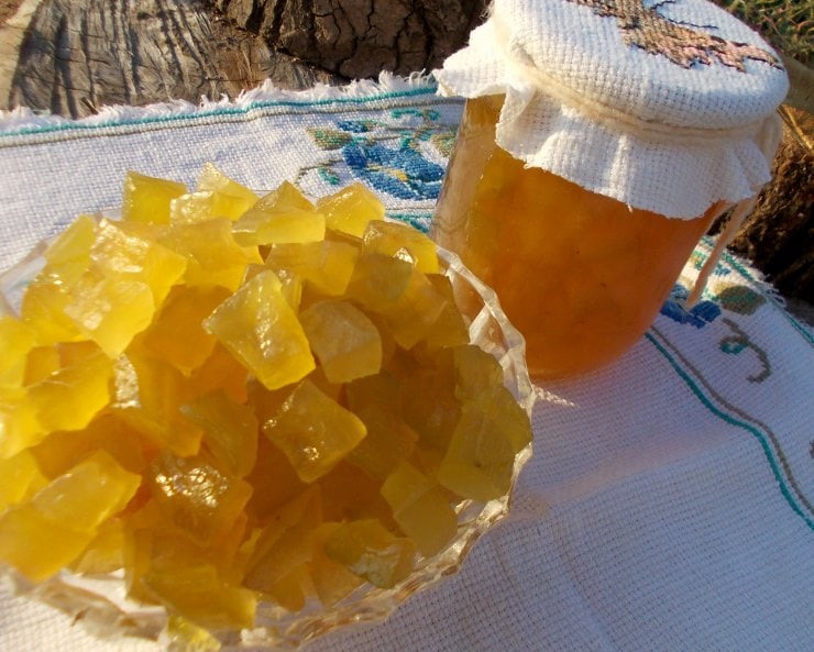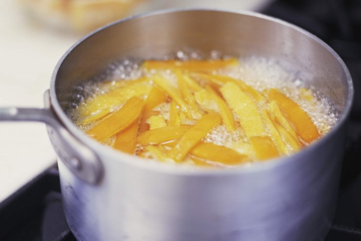 Приготовление: в готовый, горячий сахарный сироп необходимо добавить цедру цитрусовых, перемешать и залить фрукты. Емкость с фруктами необходимо хорошо встряхнуть, чтобы они покрылись заливкой равномерно.