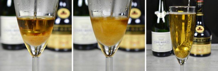 Шампанское снова аккуратно добавляется самым последним. Цедра выступит в качестве украшения получившегося коктейля.