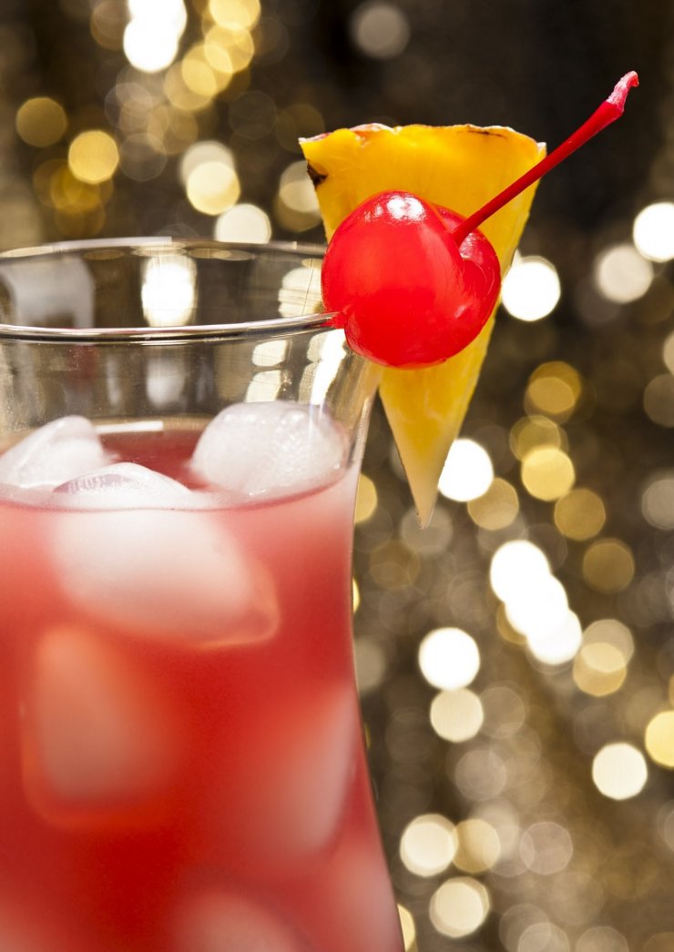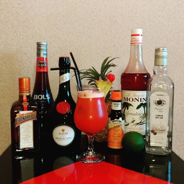 Бросьте в шейкер небольшое количество льдинок, после чего заполните цитрусовым соком. Добавьте сок ананаса, напиток Гренадин на основе гранатового сока, а также вышеперечисленные ликеры.
