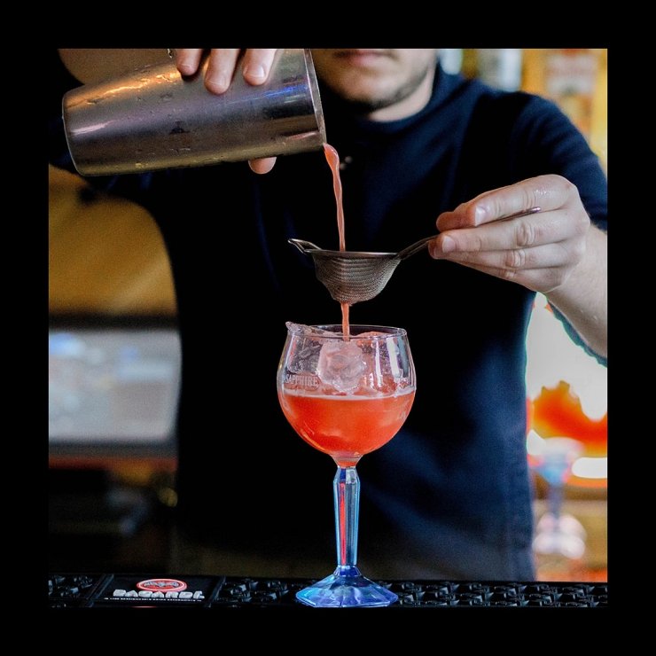 Бросьте в шейкер лед (заполните примерно до половины). Внесите сюда же подготовленные соки. Влейте джин, ликер на вишне, сироп граната и Cointreau. Добавьте небольшое количество Angostura (он придаст травянистого вкуса и свежести).