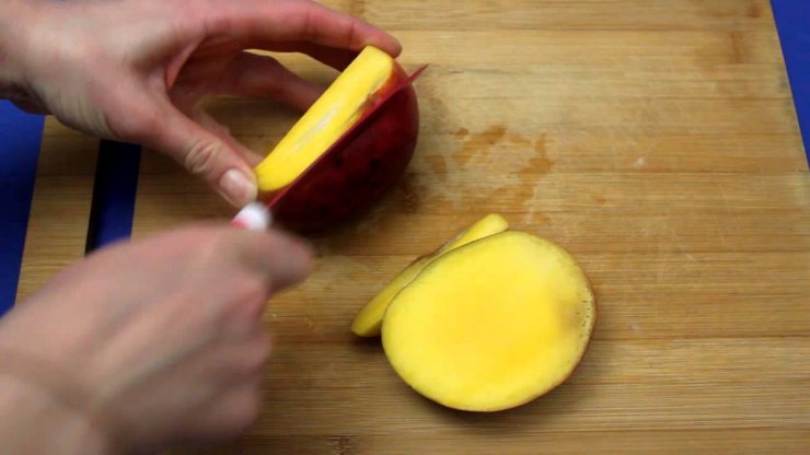 Если понюхать манго у плодоножки, то от хорошего плода исходит мягкий запах, отдаленно напоминающий персиковый. У перезрелого манго будет исходить кисловатый запах.
