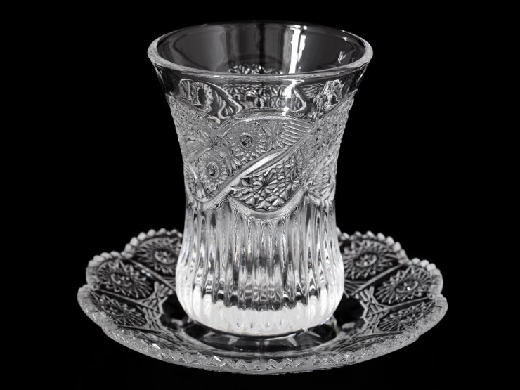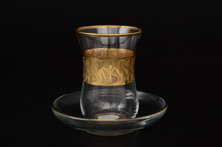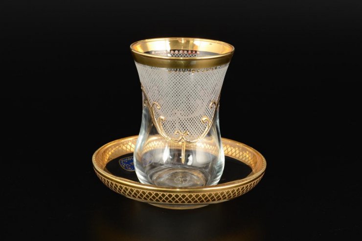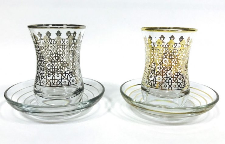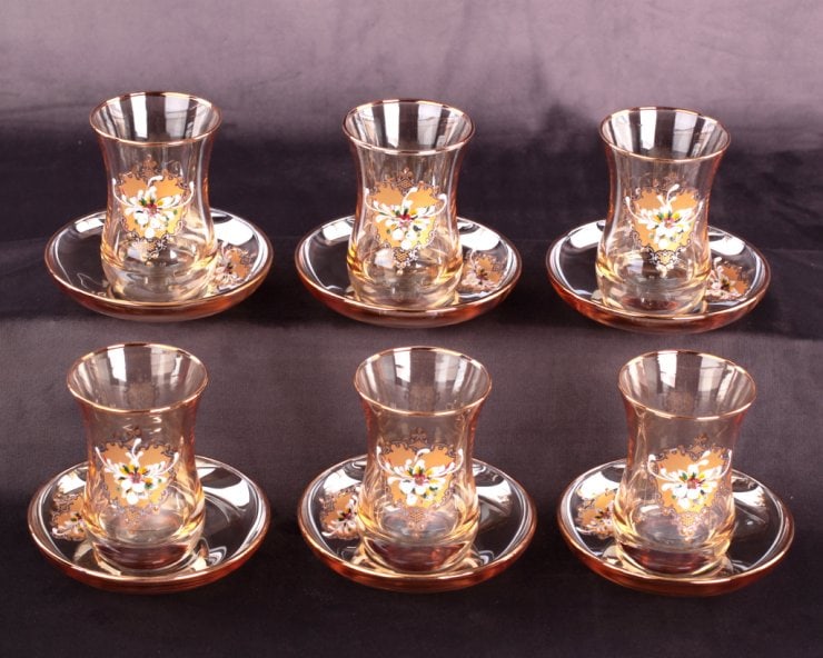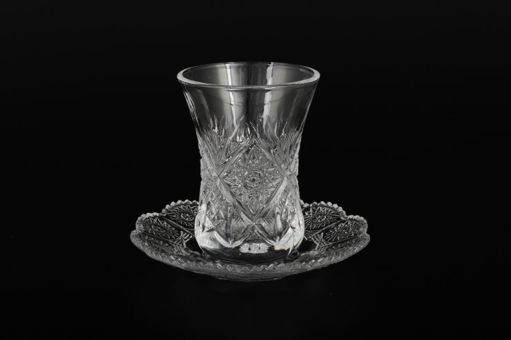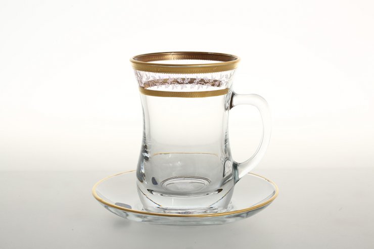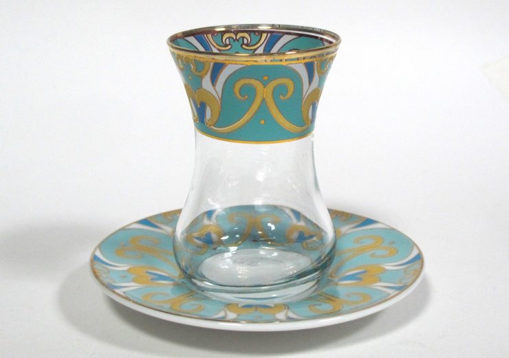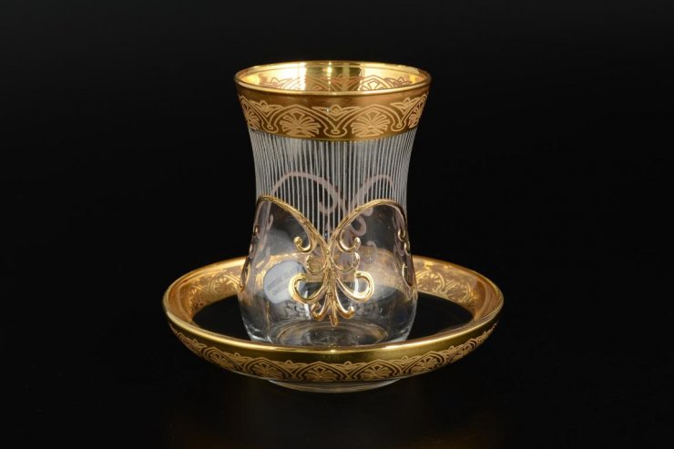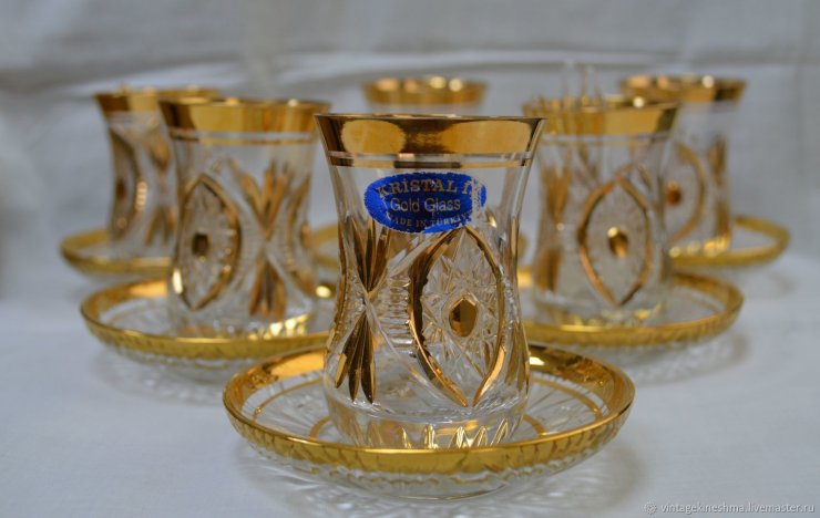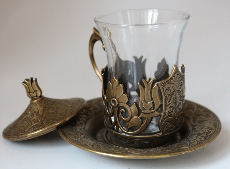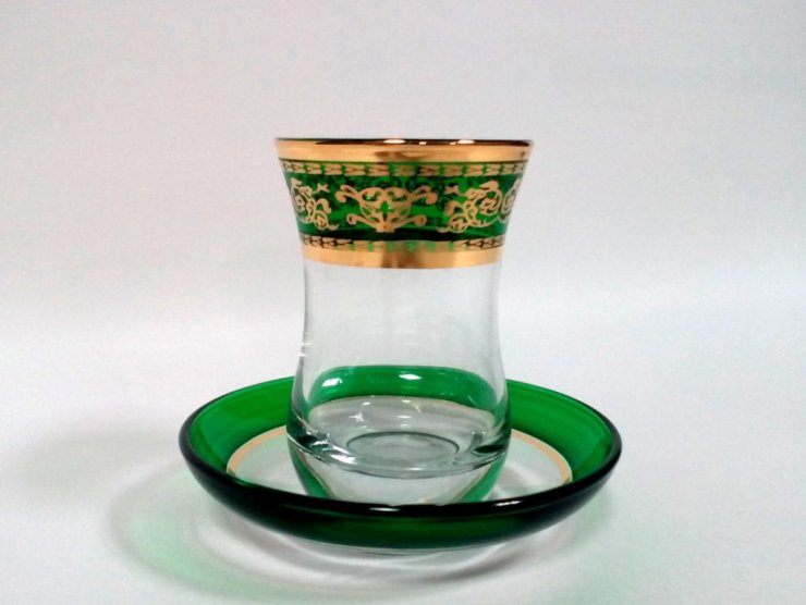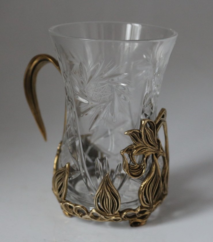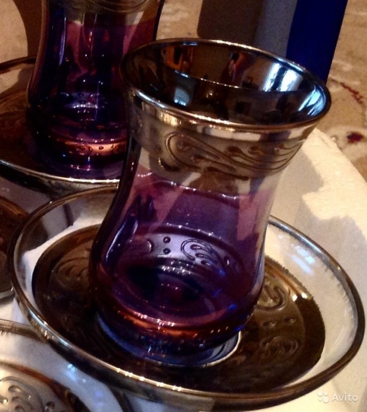 Есть варианты, когда к стеклянному стаканчику, в комплект, подают блюдца из металлов, иногда с позолотой, также богато украшенными узором.