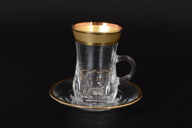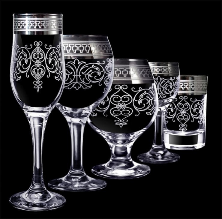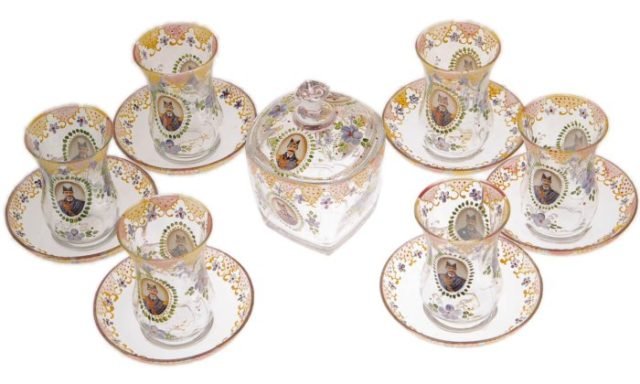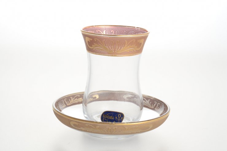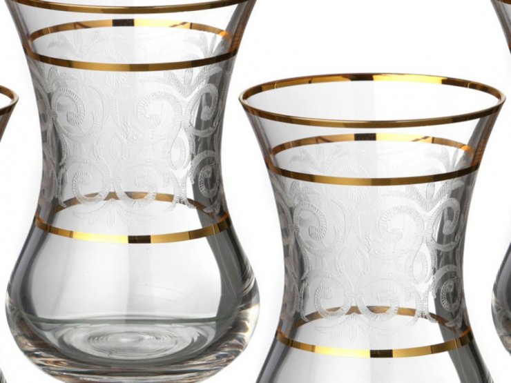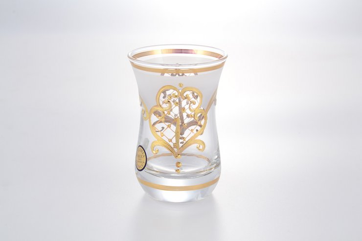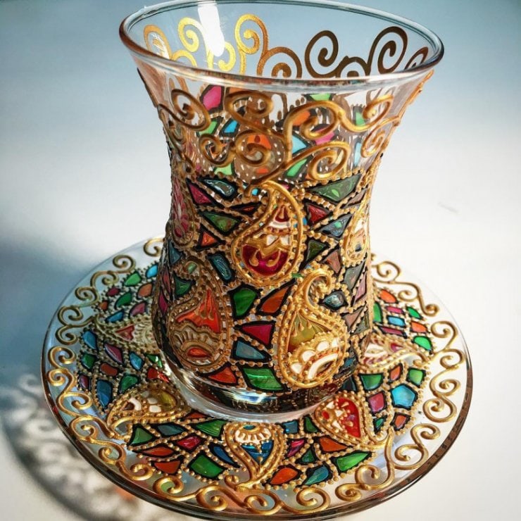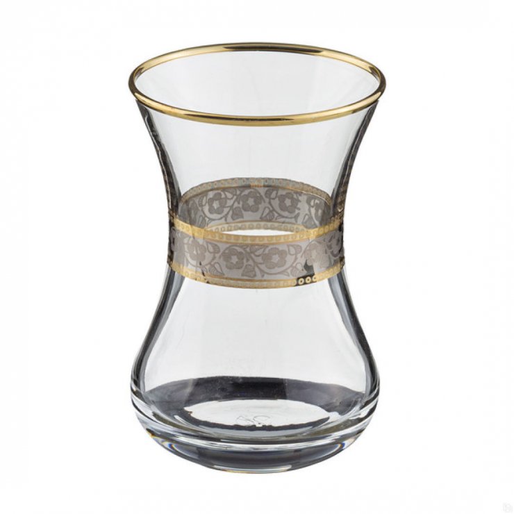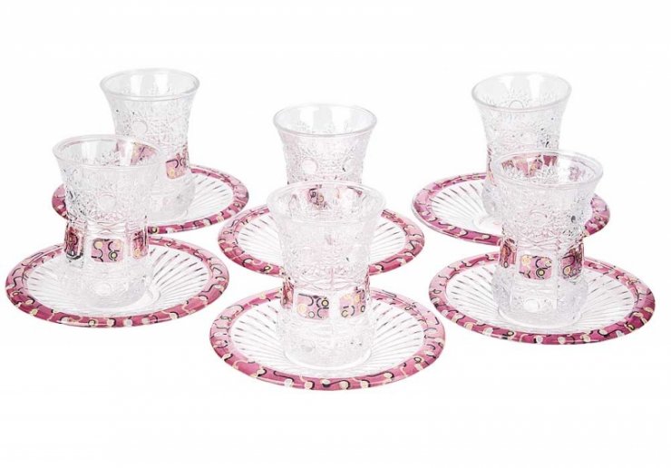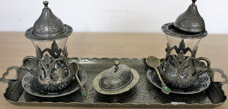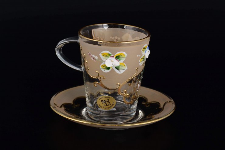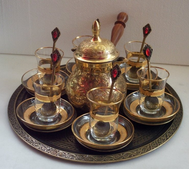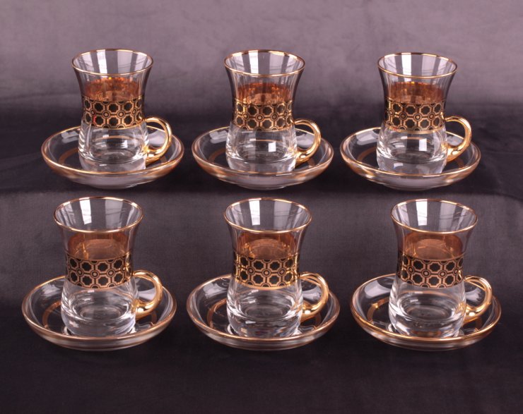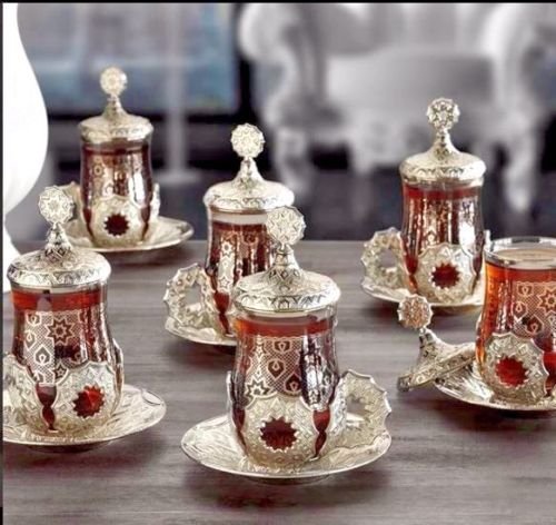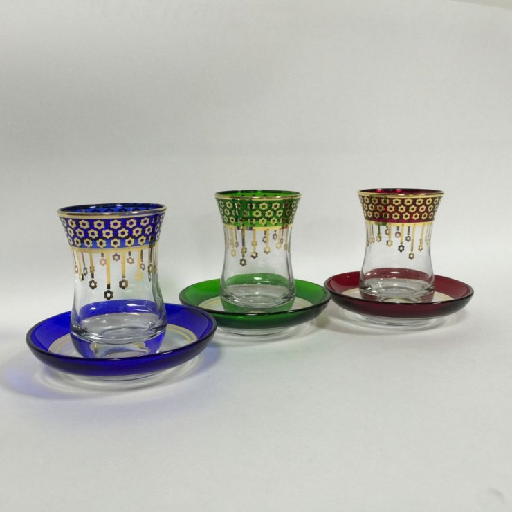 Есть варианты, когда к стеклянному стаканчику, в комплект, подают блюдца из металлов, иногда с позолотой, также богато украшенными узором.