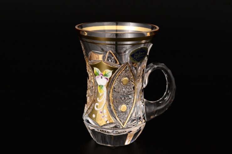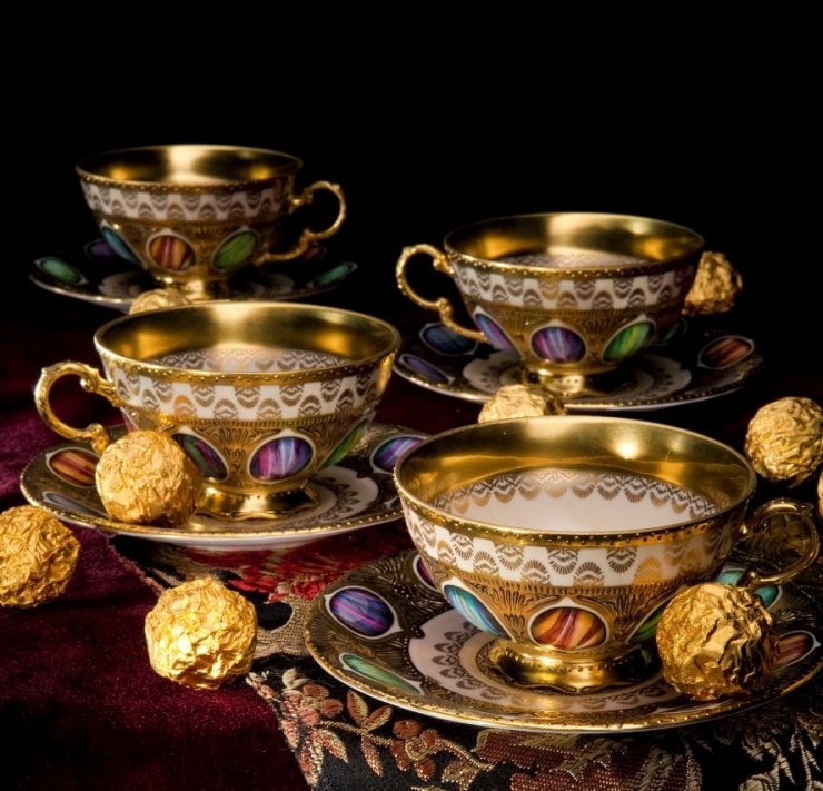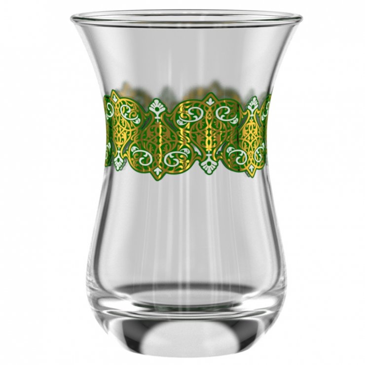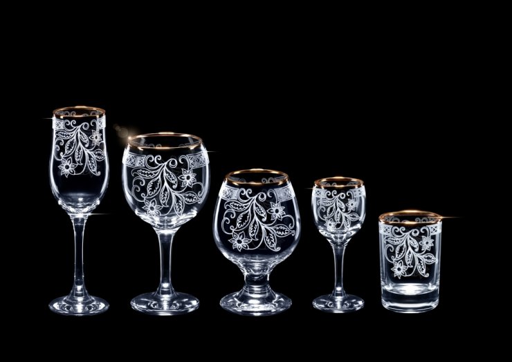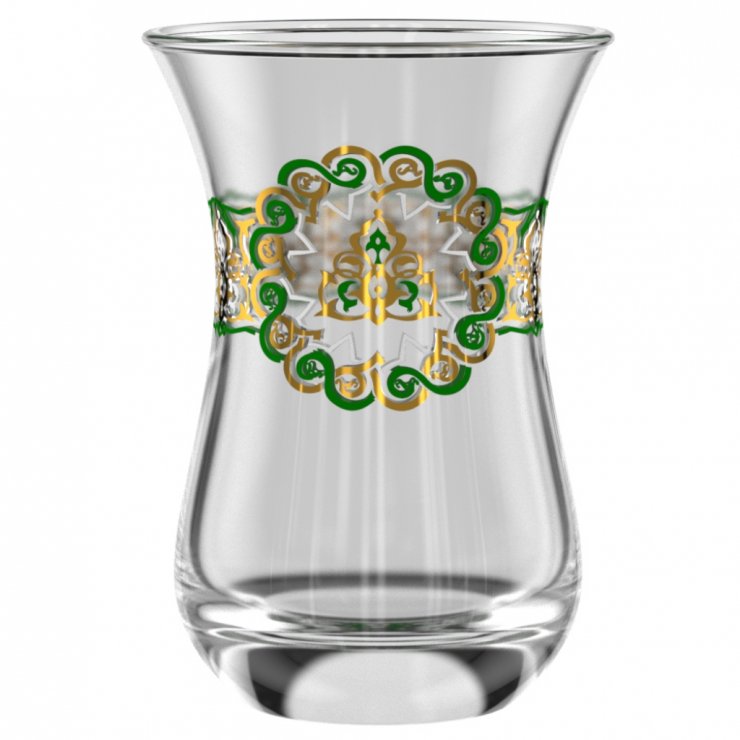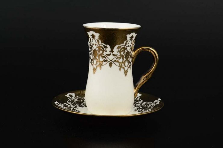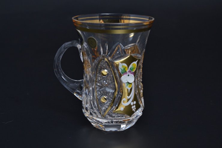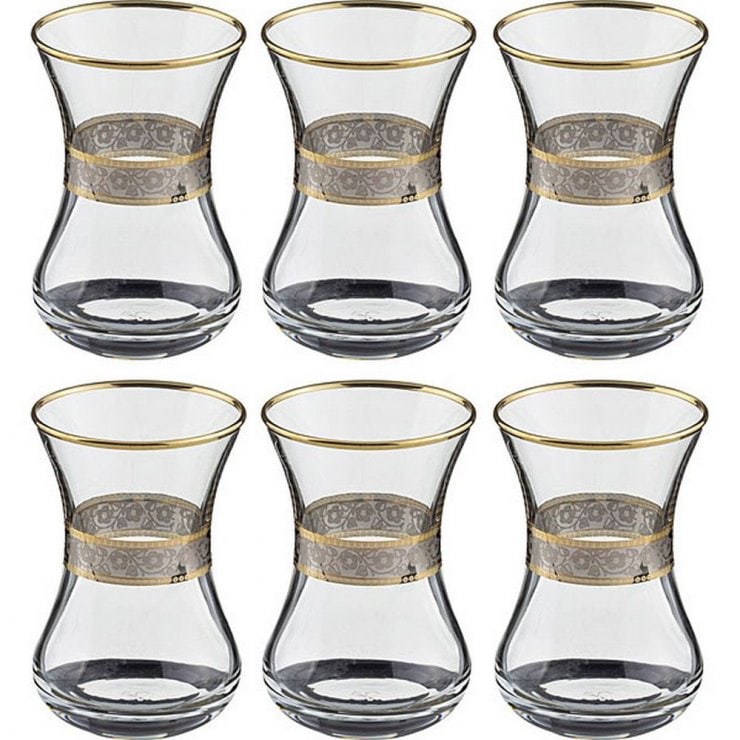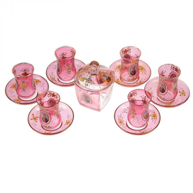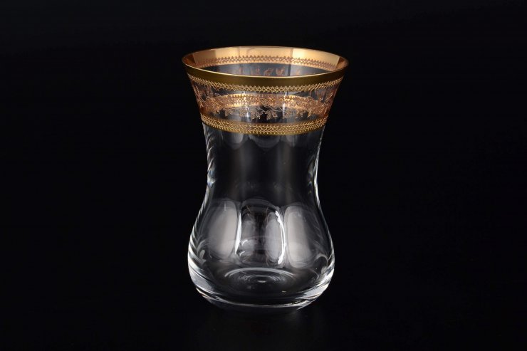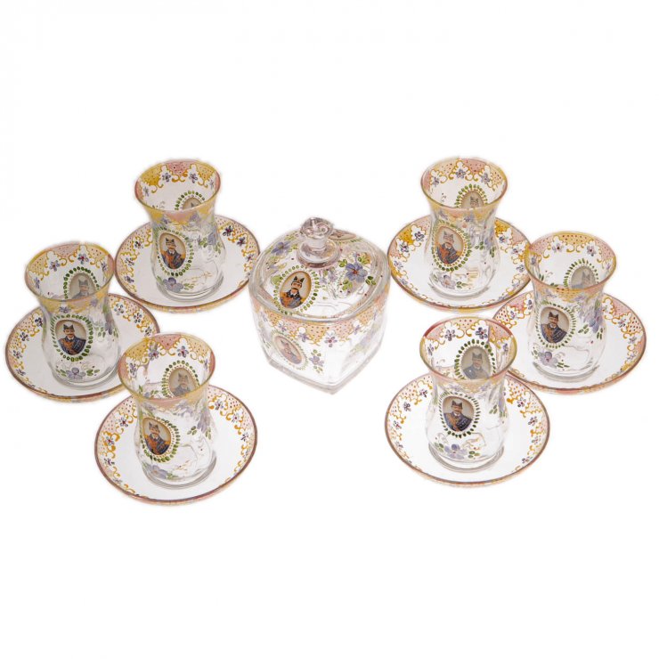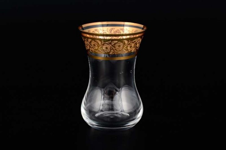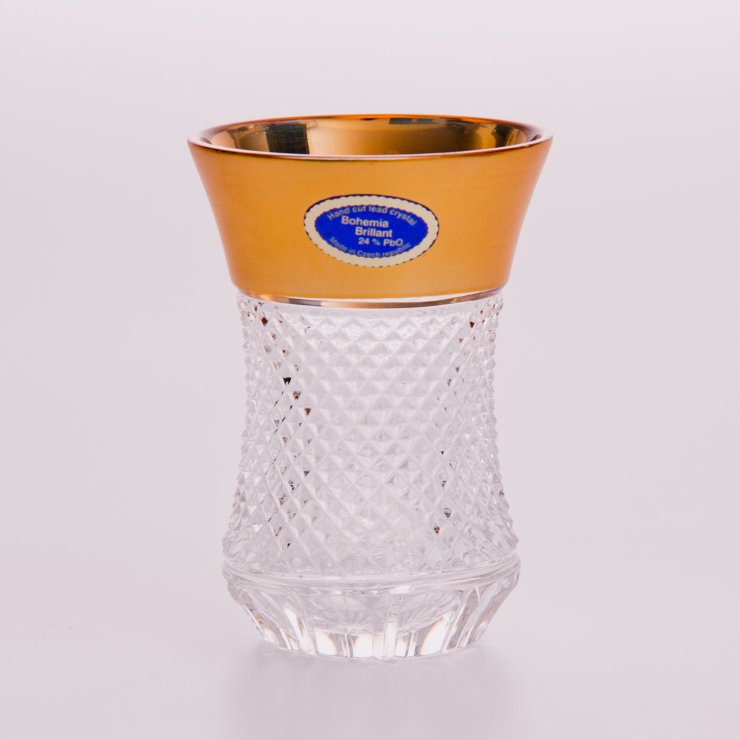 Есть варианты, когда к стеклянному стаканчику, в комплект, подают блюдца из металлов, иногда с позолотой, также богато украшенными узором.