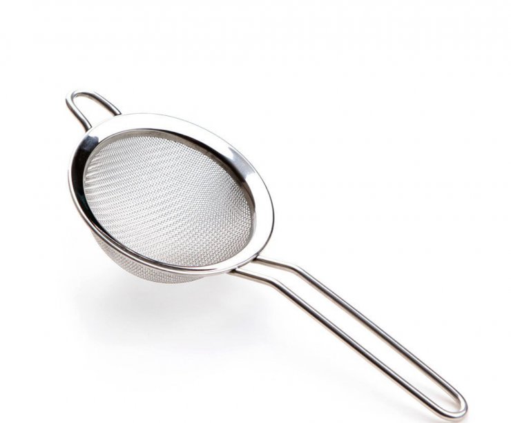 Стрейнер заменяется домашним ситечком для чая. Можно использовать «бабушкин метод» и взять марлевый отрез. Через него процеживаются крупные частицы.