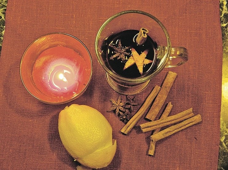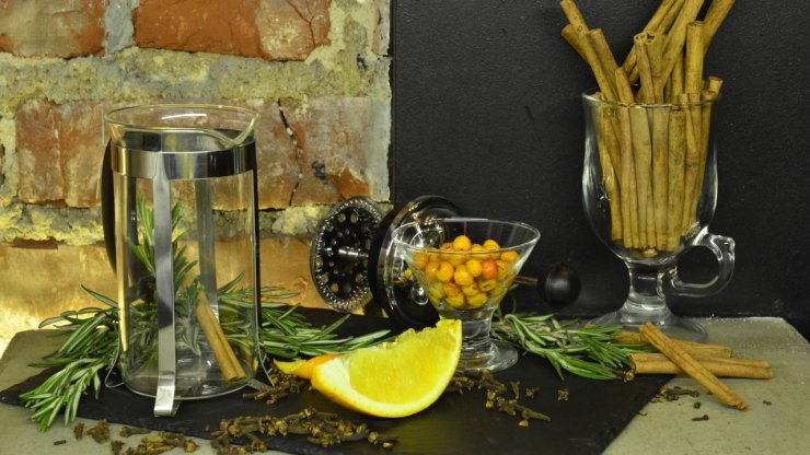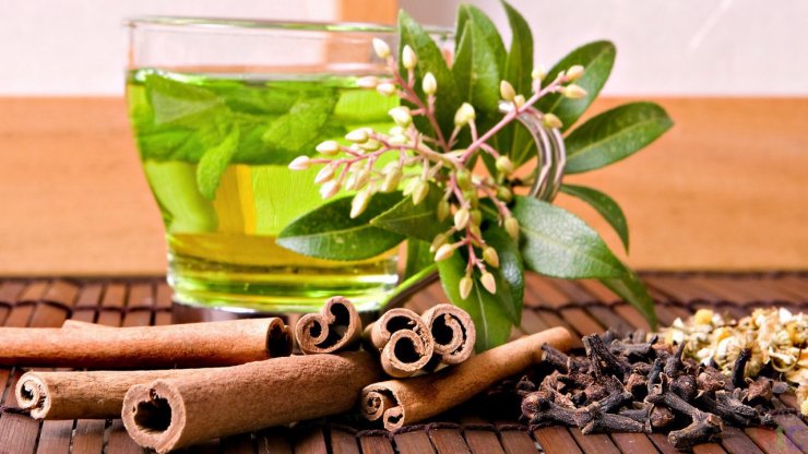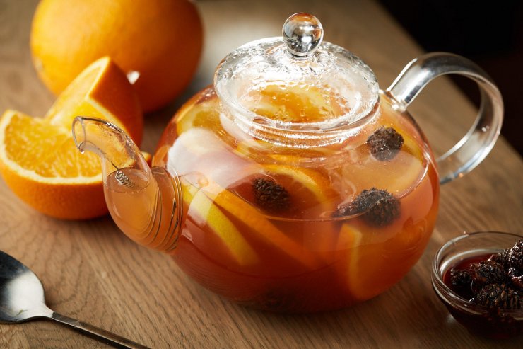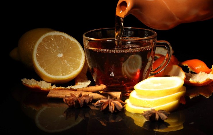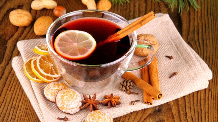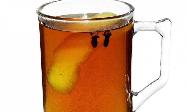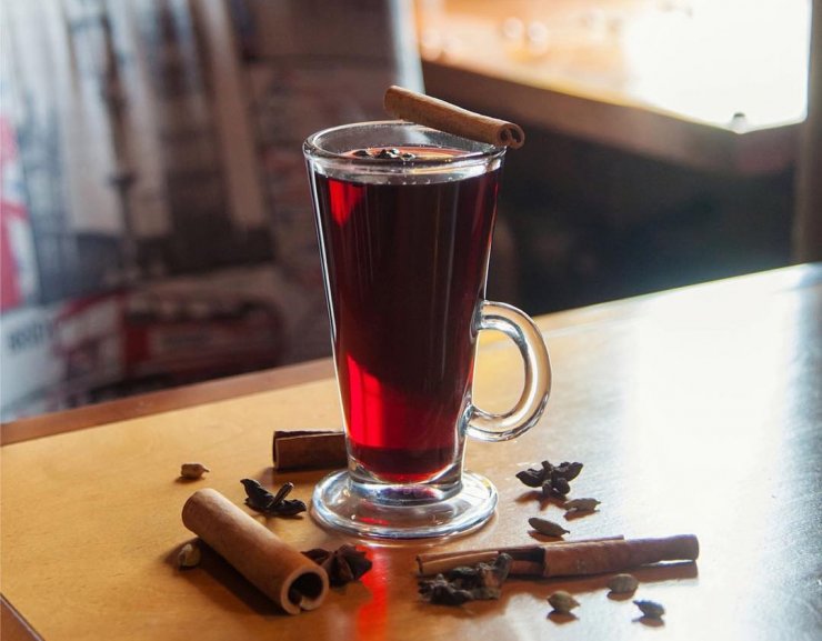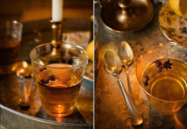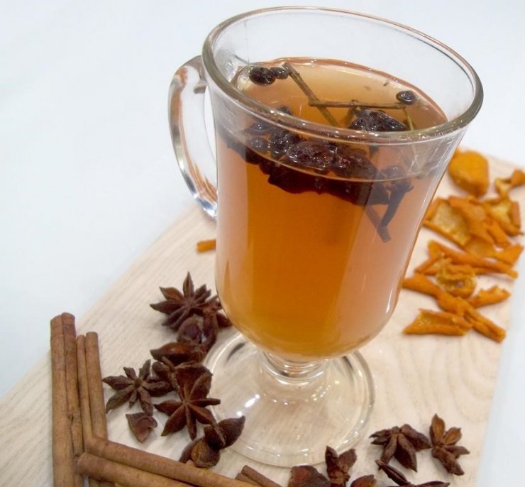 В горячий чай добавить понравившиеся пряности, например, гвоздику, одну палочку корицы, мяту и мед. Залить состав 50 миллилитрами рома или бренди.