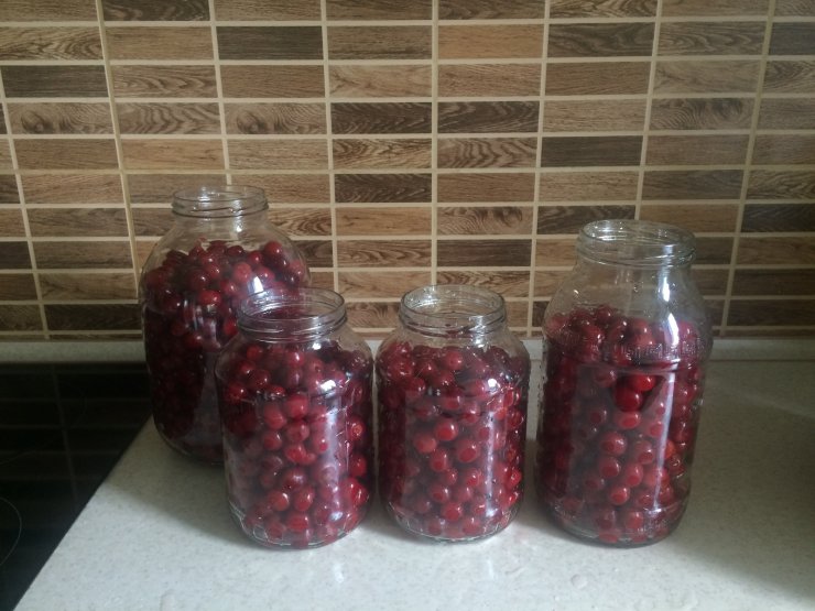 Далее вишни следует поместить в банку и засыпать сахарным песком сверху.