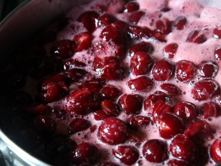 После этого необходимо освободить ягоды от косточек и измельчить плоды. В результате у вас получится вишневое пюре. На каждый килограмм массы вам требуется добавить по 200 грамм воды, и поместить в соковарку.